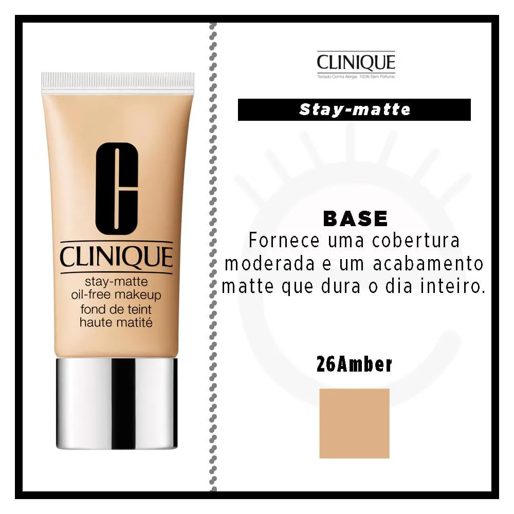 O Stay-Matte Oil-Free Makeup é uma base da Clinique que reduz o brilho causado pela oleosidade excessiva. Sua fórmula oil-free foi desenvolvida para suportar climas quentes e com grande umidade.