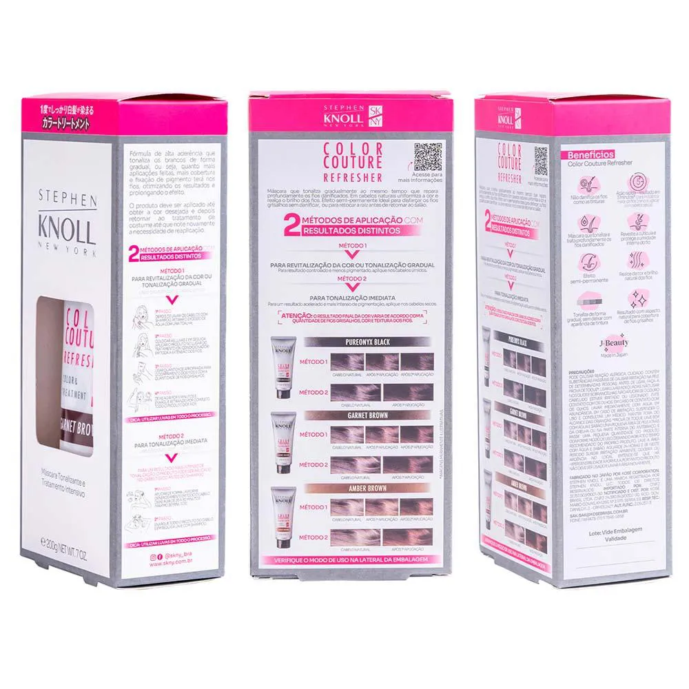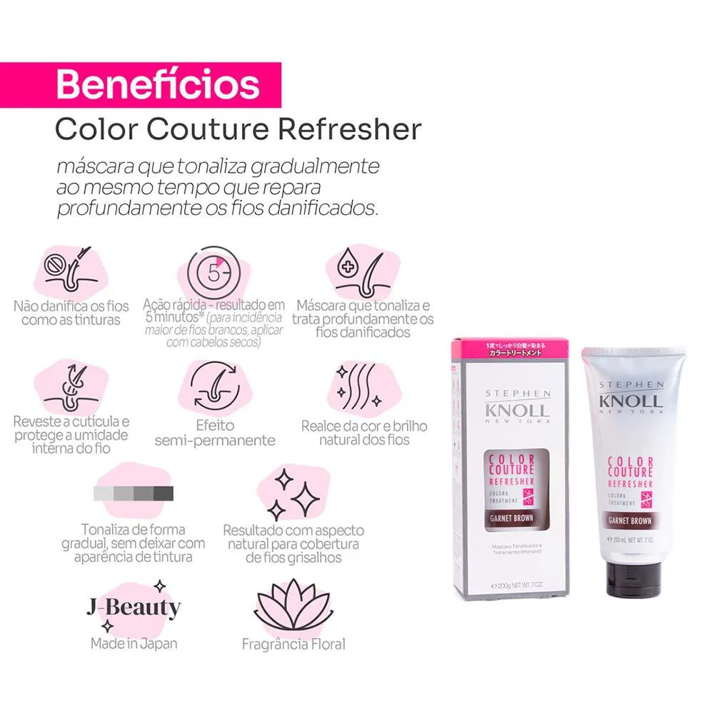 Formulada com tecnologia japonesa nos laboratórios da Kosé, Color Couture Refresher é uma máscara que tonaliza gradualmente enquanto repara profundamente os fios danificados. Em cabelos naturais uniformiza a cor e realça o brilho dos fios. Efeito semi-permanente ideal para disfarçar os fios grisalhos sem danificar, ou para retocar a raiz antes de retornar ao salão.