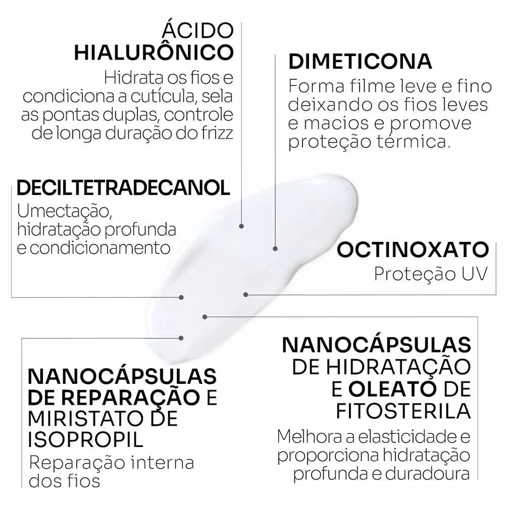 Enriquecida com ácido hialurônico, nanocápsulas de retenção hídrica, extrato de Tremella e oleato de fitosterila, essa emulsão hidrata profundamente, melhora a elasticidade e mantém o frizz sob controle ao longo do dia. A Dimeticona presente na fórmula forma uma barreira protetora que suaviza os fios, proporcionando controle absoluto, enquanto a proteção térmica e contra raios UV preserva a saúde do seu cabelo.