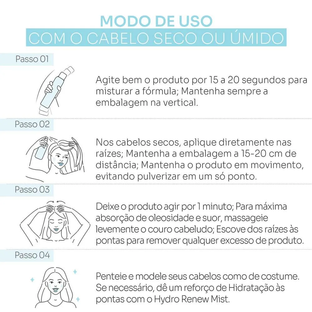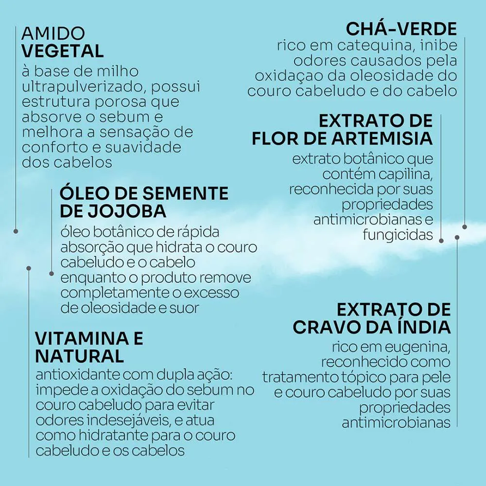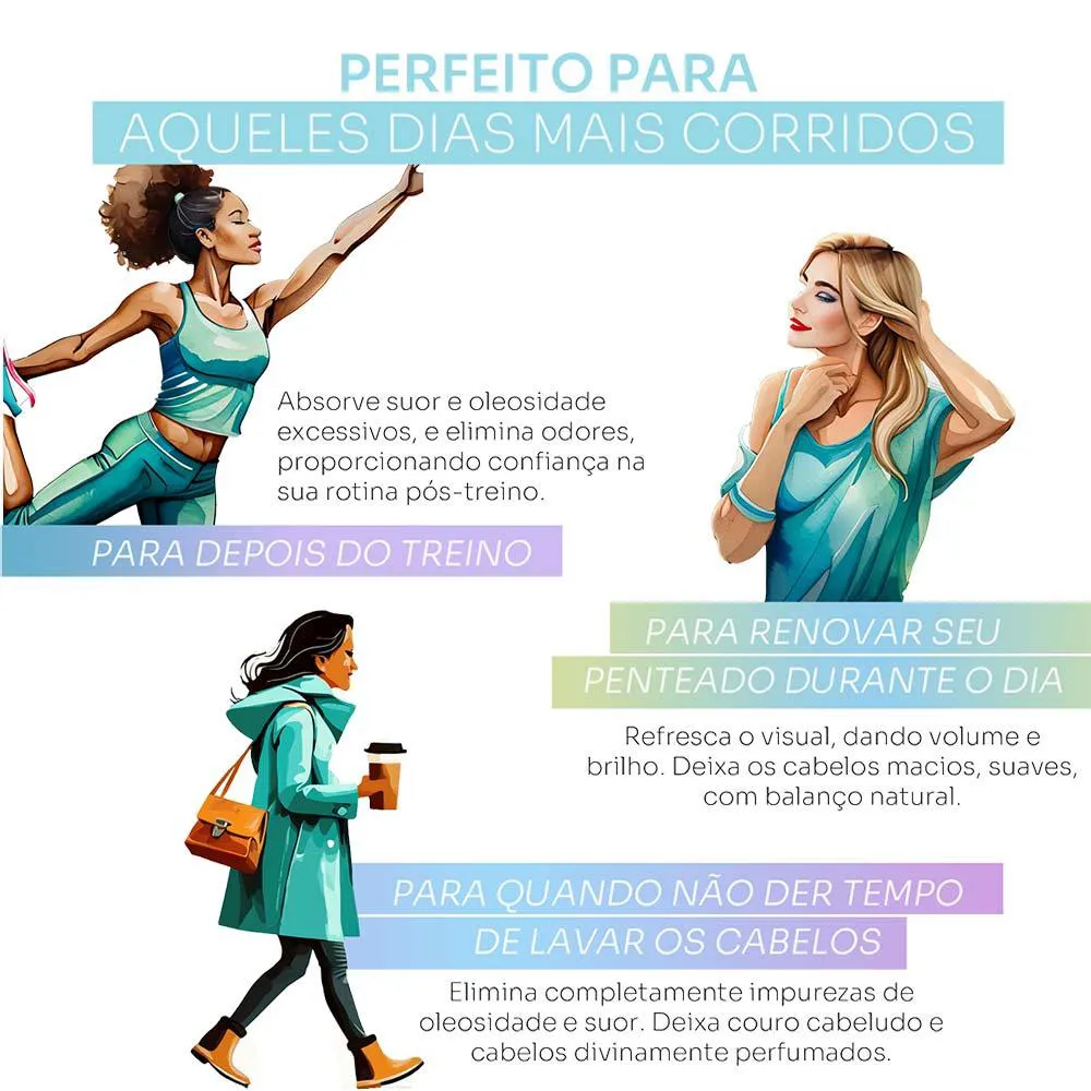 - Elimina oleosidade, suor e odores, proporcionando sensação de cabelos recém-lavados.