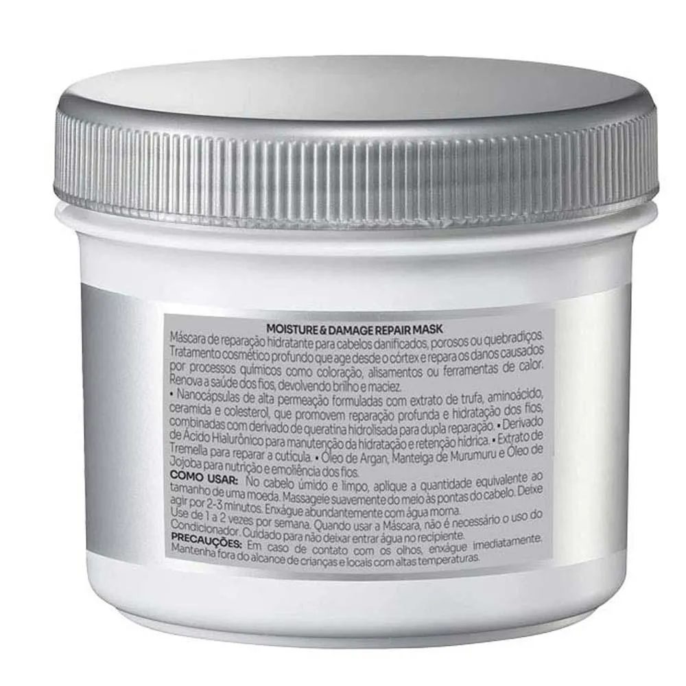 Sua fórmula contém ácido hialurônico que equilibra o teor de umidade para combater o ressecamento, queratina hidrolisada para fortalecer a fibra e aumentar a elasticidade dos fios e prevenir novos danos e quebras. Possui também óleos de argan, jojoba e manteiga de mururu para nutrição e emoliência dos fios. Uma combinação perfeita para devolver a força, vitalidade, maciez e o brilho aos cabelos.