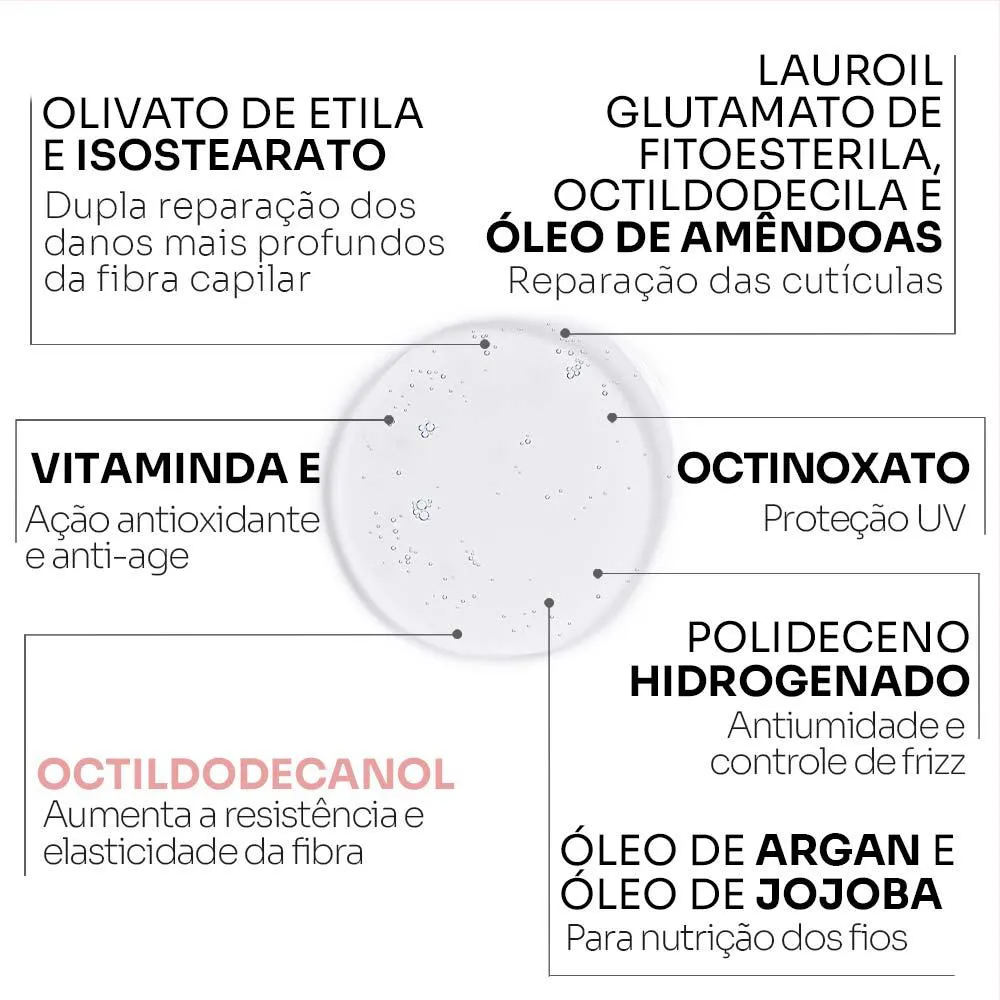 • Lauroil glutamato de fitoesterila, Octildodecila e Óleo de amêndoas sinergia de ativos de fácil espalhabilidade que aderem e revestem cada fio, promovendo reparação da cutícula.