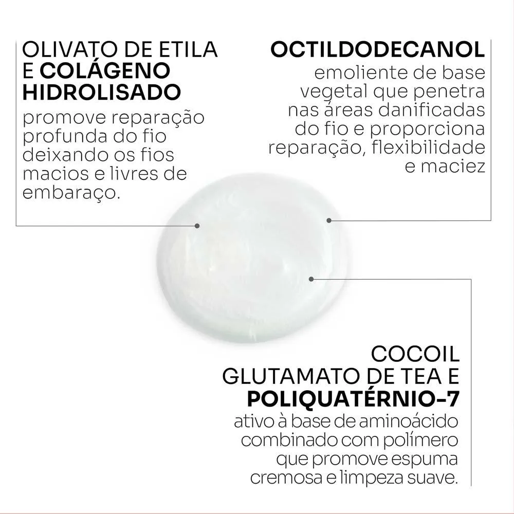 Olivato de etila e colágeno hidrolisado promove reparação profunda do fio deixando os fios macios e brilhoso.