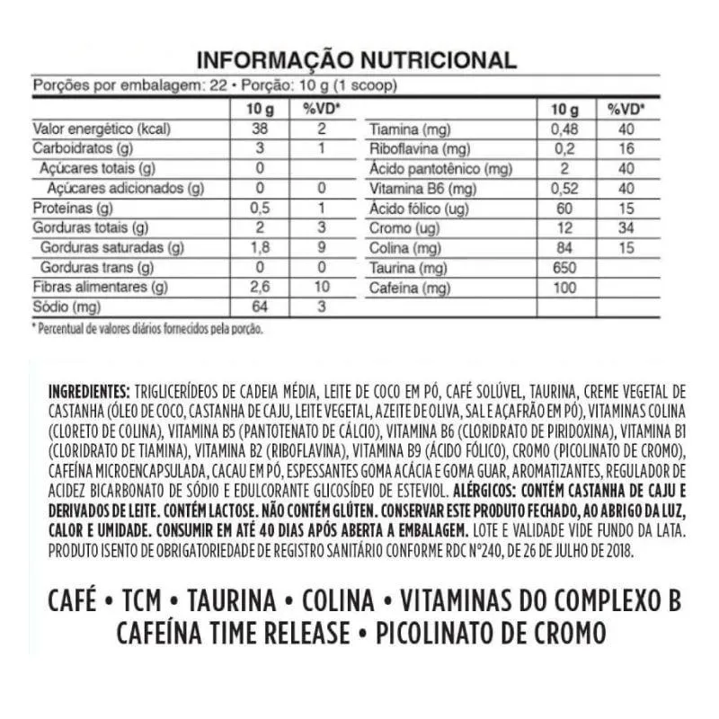 Cafeína: composto estimulante que aumenta o estado de alerta, melhorando o foco e concentração. TCM: triglicerídeos que contribuem para geração de energia para o corpo e a mente, ajuda no aumento da saciedade e digestão.Sugestão de consumo: