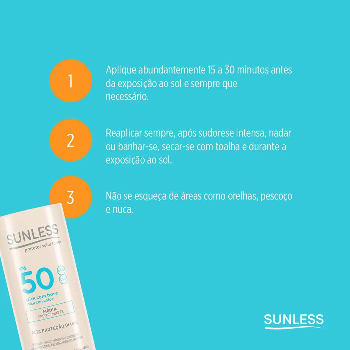 Sunless Stick é um protetor solar facial com base de alta cobertura de efeito matte que ajuda a tonalizar a pele e ainda contribui para disfarçar imperfeições e manchas. Hipoalergênico e não-comedogênico, este é um produto testado dermatologicamente para maior segurança na hora de aproveitar o sol.