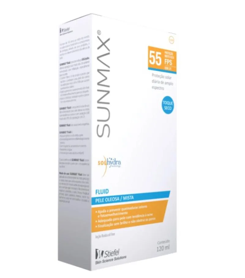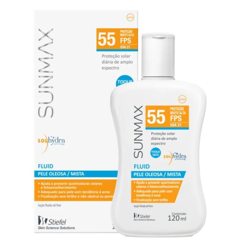 Protetor solar para pele oleosa a mista. Sunmax Fluid FPS 55 oferece toque seco, finalização sem brilho e não obstrui os poros.