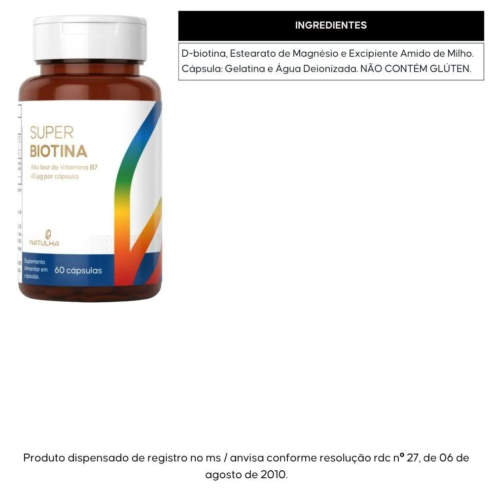 D-biotina, Estearato de Magnésio e Excipiente Amido de Milho. Cápsula: Gelatina e Água Deionizada. NÃO CONTÉM GLÚTENANVISA: "Produto indicado para maiores de 19 anos" "Este produto não é um medicamento." "Não exceder a recomendação diária de consumo indicada na embalagem." "Mantenha fora do alcance de crianças." "Este produto não deve ser consumido por gestantes, lactantes e crianças. Exceto sob orientação profissional" "Produto dispensado de registro conforme RDC 240/2018."