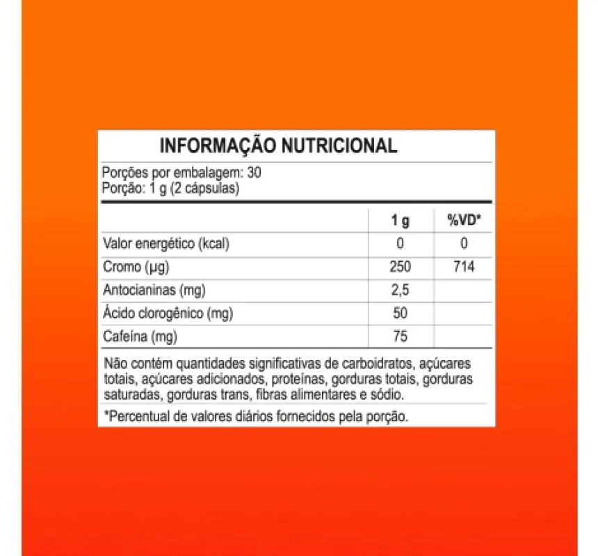 É um suplemento alimentar em cápsulas com extrato de laranja moro, café verde e picolinato de cromo. INGREDIENTES: