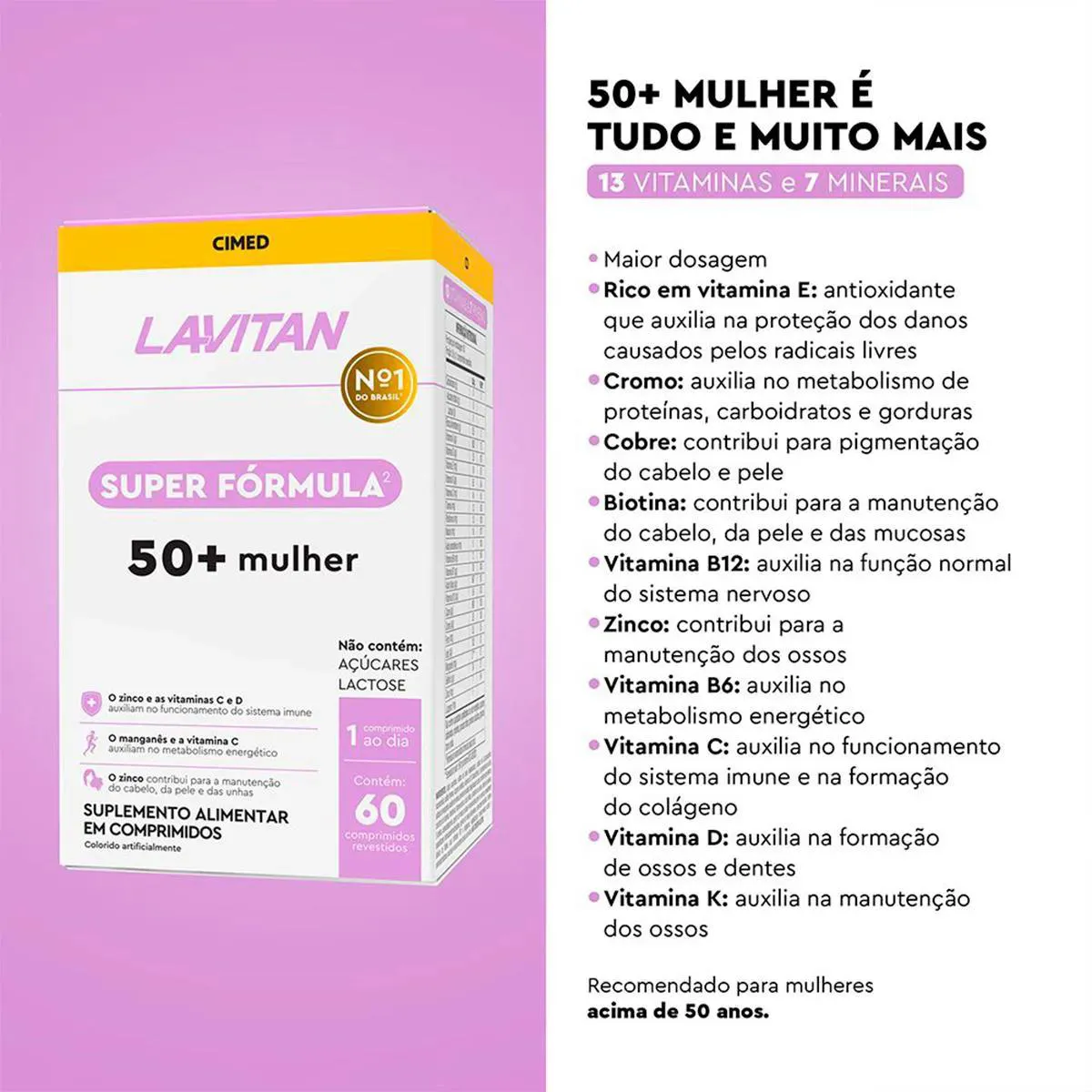 Para que serve o Lavitan Super Fórmula 50+ Mulher?Ideal para as necessidades de suplementação alimentar das mulheres acima dos 50 anos, Lavitan Super Fórmula 50+ Mulher auxilia no funcionamento do sistema imune, contribui para a manutenção do cabelo, pele e unhas e ajuda diretamente no metabolismo energético.