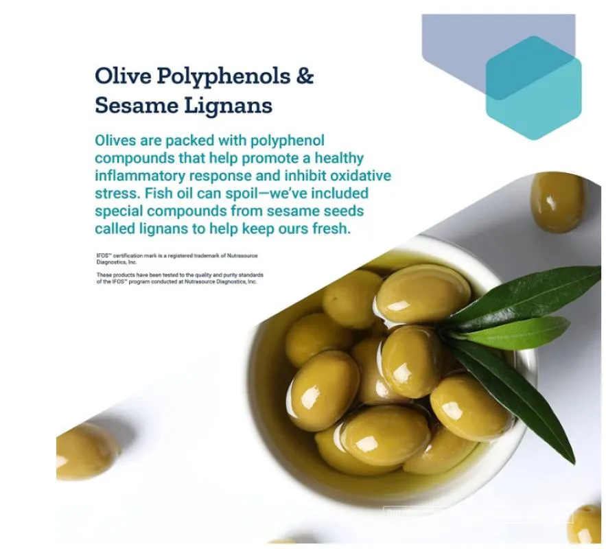 Cuide do seu coração e da sua saúde cognitiva com doses ideais de ácidos graxos ômega-3 EPA e DHA. Os ácidos graxos EPA e DHA do óleo de peixe auxiliam a saúde cardiovascular, cerebral e muito mais. Inspirado na dieta Mediterrânea, nosso Super Ômega-3 fornece os ácidos graxos ômega-3 EPA e DHA de que seu corpo precisa, além de potentes polifenóis de oliva e lignanas de gergelim, que beneficiam ainda mais a saúde cardiovascular, cognitiva e de todo o corpo. Por que adicionar lignanas de gergelim? Adicionamos lignanas de gergelim às nossas fórmulas Super Ômega-3 para aumentar os benefícios do óleo de peixe para a saúde e inibir a peroxidação. O que é extrato de oliva? Este extrato de oliva é repleto de polifenóis saudáveis para o coração, fornecendo polifenóis equivalentes a pouco mais de 4 colheres de sopa de óleo de oliva extravirgem. Benefícios: