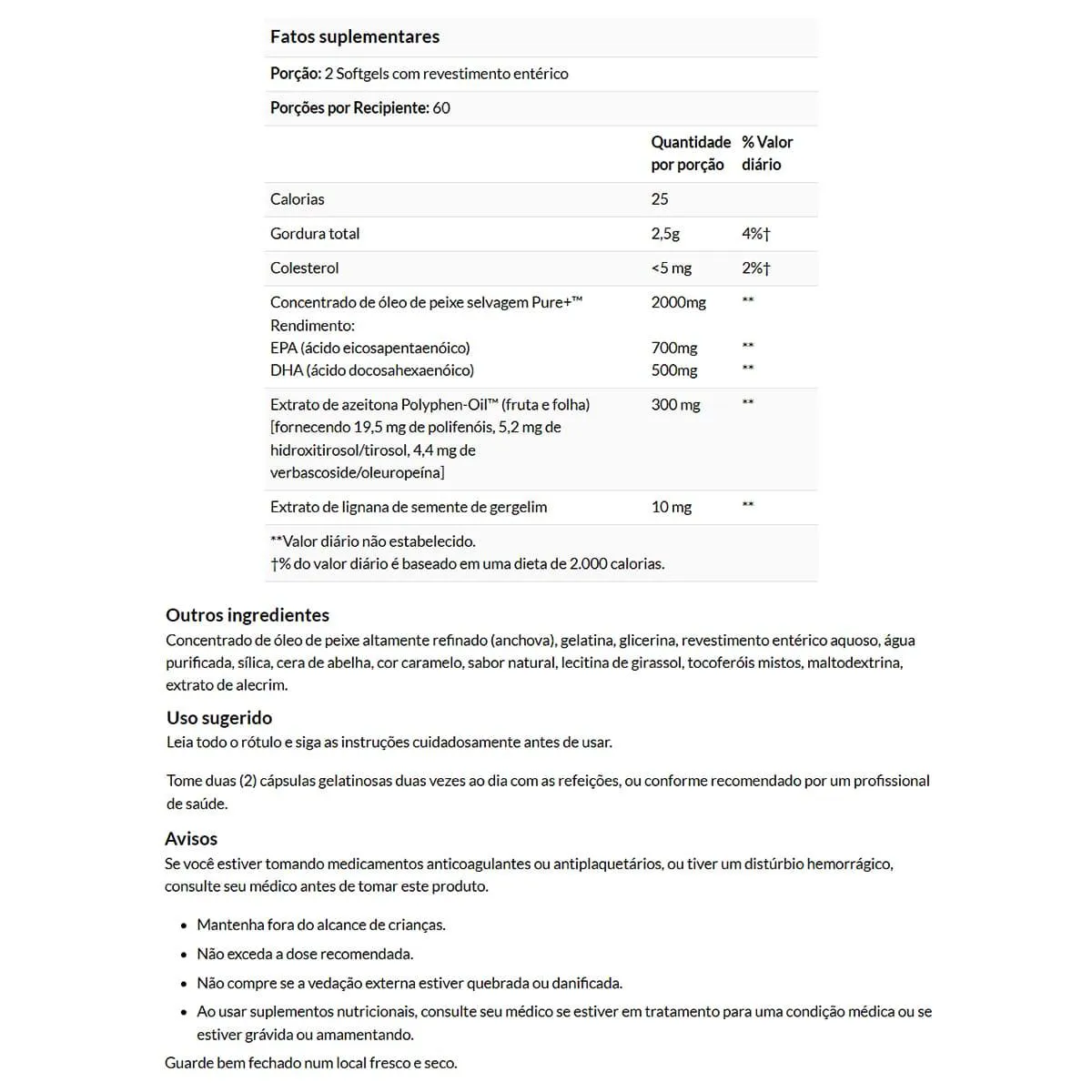 - Anchova certificada pela IFOS™ e de origem sustentável da costa do Pacífico Sul do Chile. Sugestão de consumo: Tome duas (2) cápsulas softgel duas vezes ao dia com as refeições ou conforme recomendado por um profissional de saúde.
