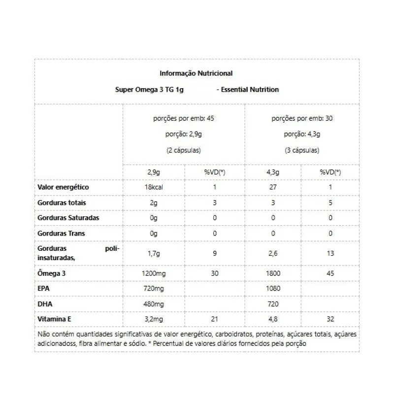 SUPER ÔMEGA 3 TG - ESSENTIAL NUTRITION O QUE É SUPER ÔMEGA 3 TG O ômega-3 é amplamente estudado pela ciência. Seu consumo auxilia na manutenção de níveis saudáveis de triglicerídeos desde que associado a uma alimentação equilibrada e hábitos de vida saudáveis. Mas, para que possa levar somente benefícios ao organismo, sua concentração e pureza são essenciais. O Super Ômega 3 TG Essential é obtido por processo patenteado de destilação molecular, que oferece alta concentração de EPA e DHA e padrões de pureza extremamente rígidos em relação aos metais pesados e demais contaminantes como PCBs, mercúrio e dioxinas.