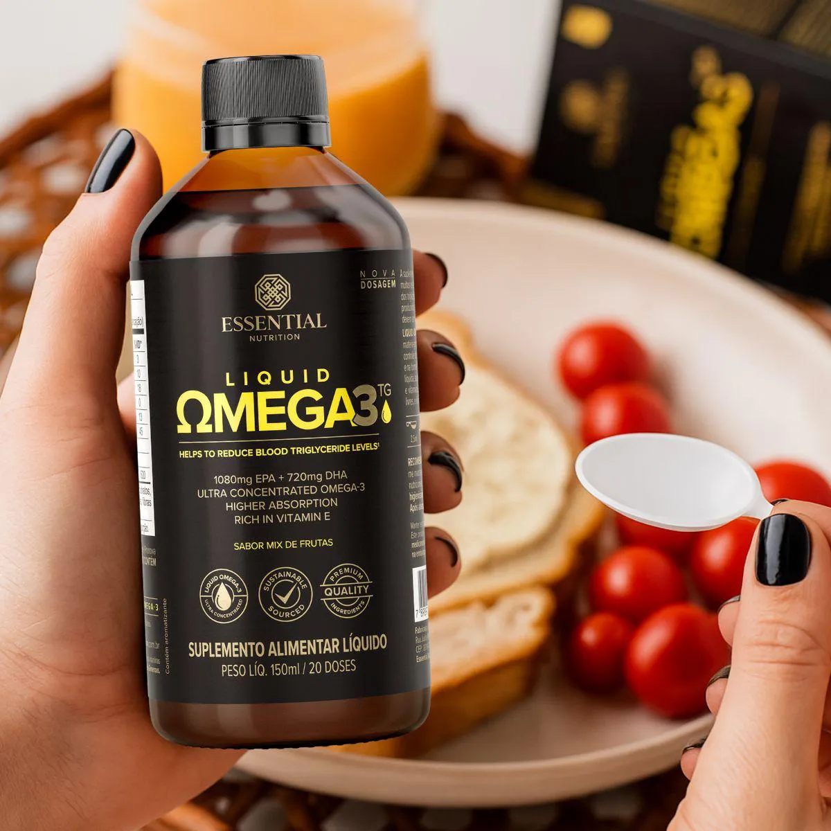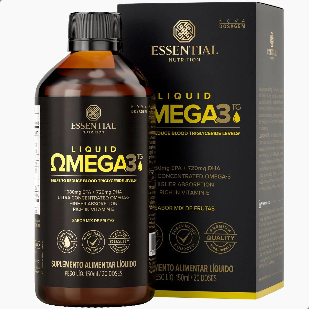 Super Ômega-3 TG Liquid da Essential Nutrition é um óleo de peixe líquido de 150 ml, fornecendo cerca de 20 doses concentradas de EPA e DHA. A apresentação em frasco com colher dosadora permite ajustar a porção conforme a necessidade.