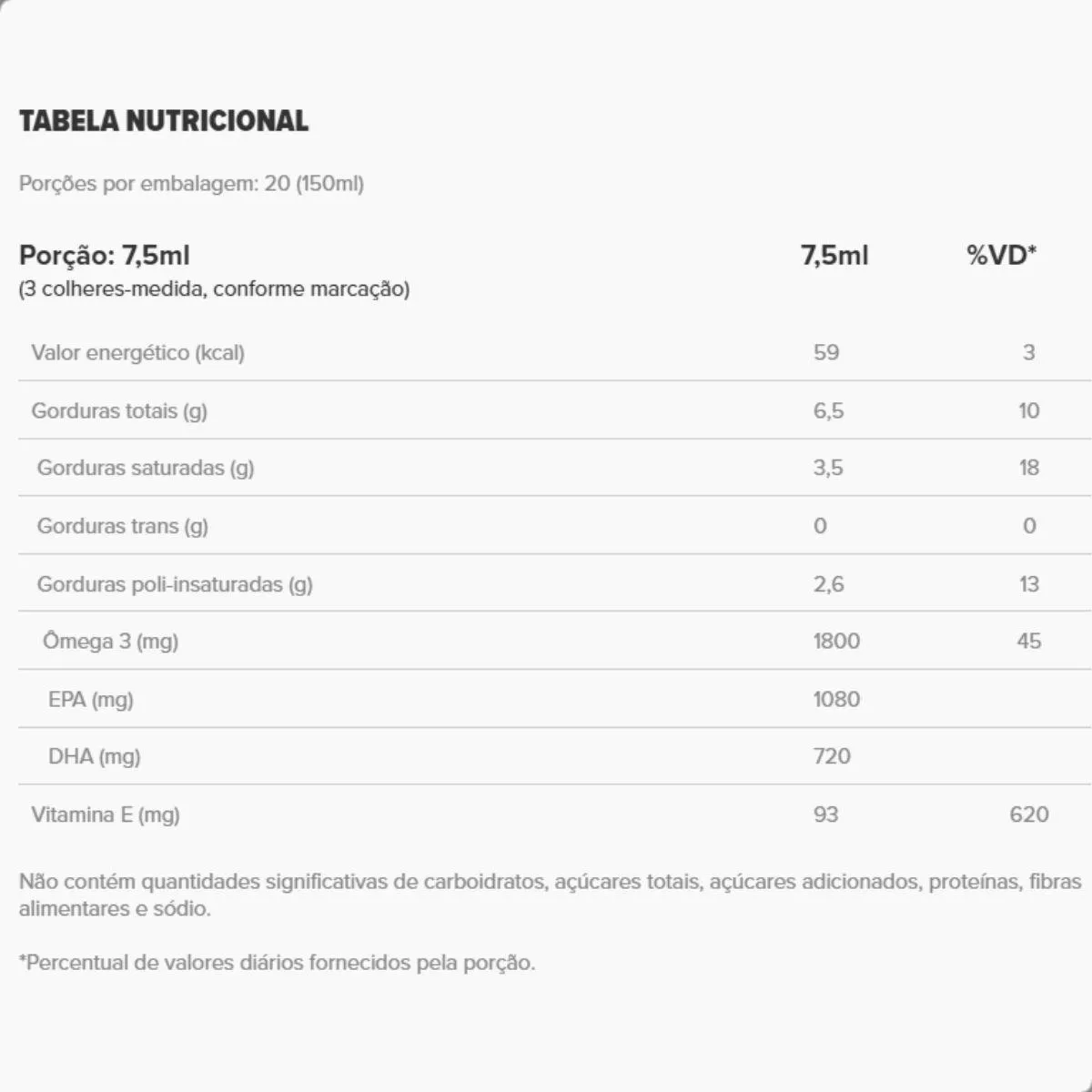 A fórmula utiliza óleo de peixe purificado em forma triglicerídeo, com sabor suave e adição de vitamina e natural para preservar a estabilidade. Não contém glúten, lactose, açúcares, corantes ou aromas artificiais.