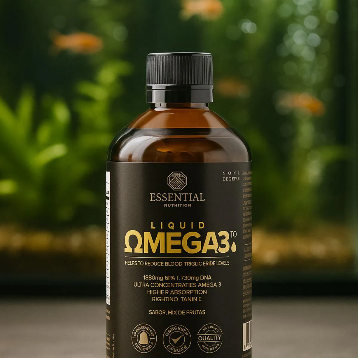 Palavras-chave como ômega-3 líquido, EPA, DHA, triglicerídeo, óleo de peixe e nutrição complementam o posicionamento do produto como aliado na rotina de saúde.