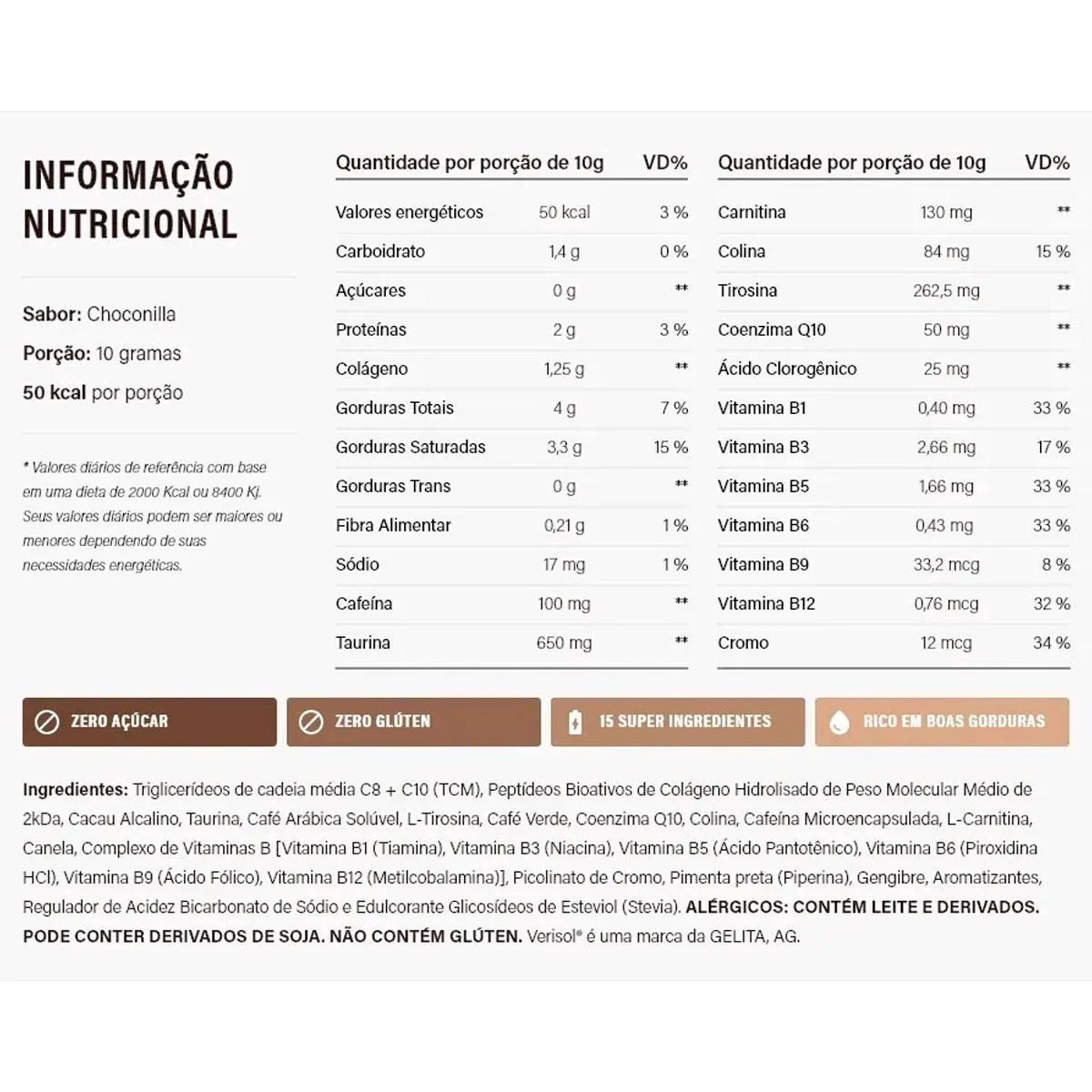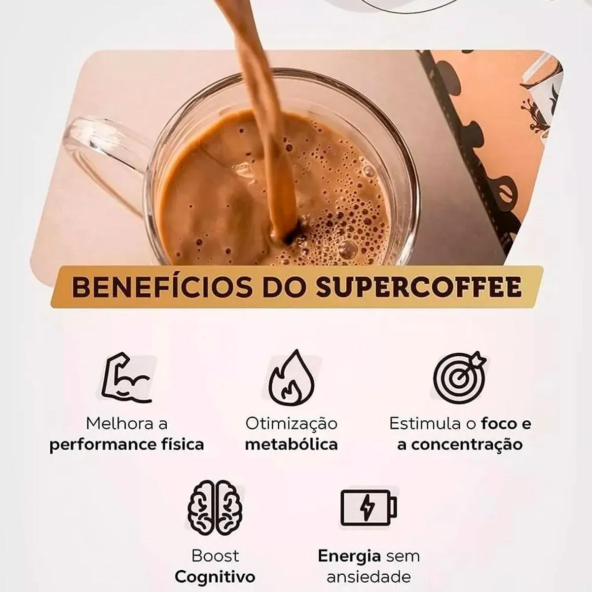 Novo SUPERCOFFEE 3.0 Economic Size 380g O Primeiro Smart Energy Do Mundo Energia Física E Mental Que Não Oscila Rico Em Boas Gorduras 15 Super Ingredientes Com 1,25g colágeno VERISOL Com 250mg CAFÉ VERDE Com 262,5 mg L-TIROSINA Com 50 mg COENZINA Q10 Zero Açúcar Zero Glúten O Supercoffee que você já conhece com cheirinho irresistíveis uma textura e leveza maravilhosas, agora ainda mais mais gostoso e o efeito muito potente na versão 3.0. Sua dose extra de energia smart - estável e boa para o corpo e a mente. Um blend de ingredientes que atua de forma combinada no estímulo à energia, resistência e humor diário, para você curtir cada desafio conquistado. O SuperCoffee 3.0 é um blend energético completo pensado para o seu bem-estar. Ele reúne múltiplos ativos em apenas uma fórmula. TCM C8 E C10 São os melhores tipos de TCM disponíveis: fontes puras de energia e grandes potencializadores de corpos cetônicos. Bom para: saciedade, boa digestão e energia cerebral. 50MG DE COQ10 A CoQ10 (50mg) tem propriedades antioxidantes e é fundamental para a produção de energia nas mitocôndrias das células, essencial para o bom funcionamento do organismo. COLÁGENO VERISOL® Único colágeno (1,25g) com comprovação científica de resultados, especialmente desenvolvido para manutenção da saúde da pele, melhorando a elasticidade e firmeza, além do fortalecimento das unhas e cabelos. L-TIROSINA Aminoácido precursor de neurotransmissores como a dopamina. Sua suplementação pode melhorar o seu humor e memória em situações de stress, assim como a sensação de bem-estar. ENERGIA LIMPA E SEM OSCILAÇÃO CAFÉ ARÁBICA + TAURINA + COQ10 (NOVO!) + TCM C8 E C10 + L-TIROSINA (NOVO!) Energia smart - natural, na medida e estável - para você ser você por inteiro. Sem sensação de nervosismo e/ou ansiedade. Um blend de ingredientes que atua de forma combinada no estímulo à energia, resistência e humor diário, para você curtir cada desafio conquistado. FOCO E PERFORMANCE COGNITIVA COMPLEXO B + COLINA + CROMO + CAFEÍNA MICROENCAPSULADA Uma dose de SuperCoffee pode te levar a um estado onde tudo flui - corpo e mente em perfeita harmonia para alcançar a excelência enquanto trabalha ou estuda. O blend cognitivo atua no suporte da sinalização celular, transportando, estimulando ou equilibrando os sinais entre neurônios, células nervosas e outras células do corpo. METABOLISMO E BEM-ESTAR COLÁGENO VERISOL® (NOVO!) + CANELA + PIMENTA PRETA + GENGIBRE + CAFÉ VERDE (NOVO!) + L-CARNITINA O avanço da idade altera o funcionamento do corpo e a suplementação faz toda diferença. Alcançar um estado de otimização metabólica é sinônimo de potencializar suas funções vitais. Ativos com ação antioxidante e termogênica agem estimulando o metabolismo. Já o colágeno, uma das proteínas mais importantes para o corpo, é especial para a saúde da pele, cabelo e unhas, ajudando a mantê-los fortes e saudáveis. Ao escolher o SuperCoffee 3.0, você economiza 75% em comparação à compra dos suplementos individualmente. Para usar: Manhã: em jejum ao acordar para uma explosão de energia no início do seu dia. Treino: 30 minutos antes para acelerar o seu metabolismo e dar um suporte muscular com muita energia. Trabalho: Para ajudá-lo a se concentrar no trabalho ou antes de uma grande reunião. Estudo: Para te focar nos estudos ou antes de importantes prova Como devo tomar meu SuperCoffee? O SuperCoffee é um produto instantâneo em pó. Basta adicionar uma porção (10g ou dosador) em 100ml de água quente ou gelada. Recomendamos o consumo de 2 doses diárias para otimizar o resultado! Latão 380g de produto em pó rende até 38 doses. Advertências: "ESTE PRODUTO NÃO É UM MEDICAMENTO" "ESTE PRODUTO É UM SUPLEMENTO ALIMENTAR" "MANTENHA FORA DO ALCANCE DE CRIANÇAS" "NÃO EXCEDER A RECOMENDAÇÃO DIÁRIA DE CONSUMO INDICADA NA EMBALAGEM" Registro no M.S. nº Produto dispensado de registro RDC 240 de 2018