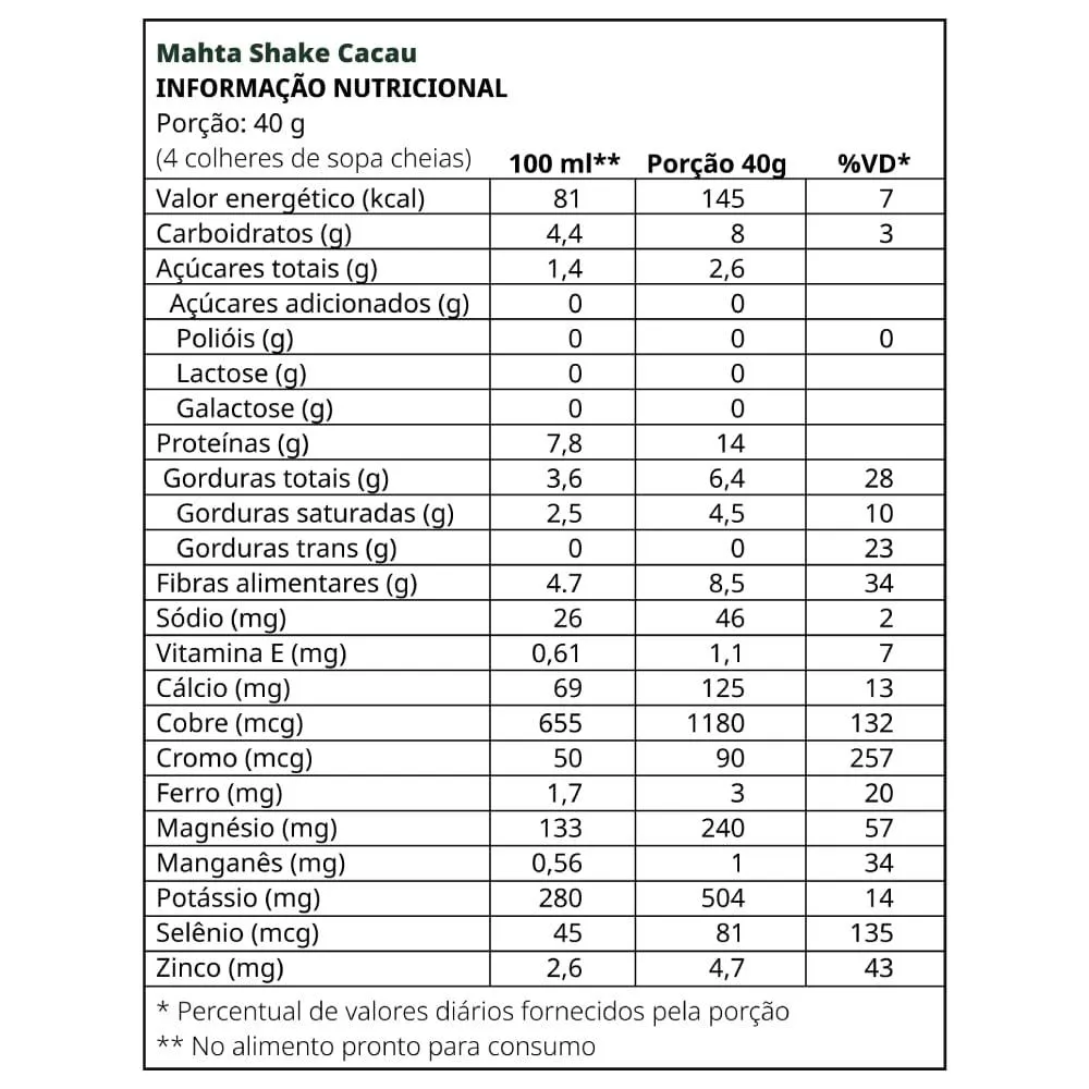 O Shake de Superfoods Mahta sabor cacau selvagem, cupuaçu e cumaru é elaborado com ingredientes naturais da Amazônia, unindo sabor marcante e nutrição em cada dose. Fonte de antioxidantes, proteínas e fibras, oferece uma combinação equilibrada e cheia de autenticidade._x000D_