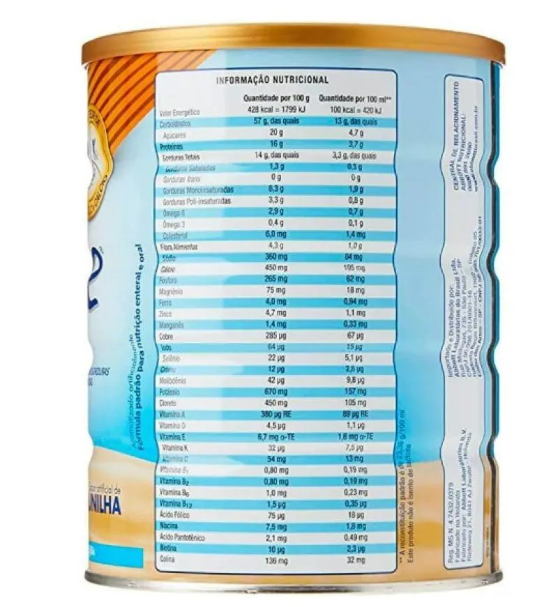 COMPOSIÇÃO Maltodextrina, Sacarose, Óleos Vegetais (Óleo Vegetal de Girassol Altamente Oléico, Óleo Vegetal de soja, Óleo Vegetal de Canola e Óleo Vegetal de Milho), Caseinato de Cálcio, Minerais (Citrato de Sódio, Citrato de Potássio, Carbonato de Cálcio, Cloreto de Magnésio, Fosfato de Potássio Dibásico, Cloreto de Potássio, Cloreto de Sódio, Fosfato de Sódio Monobásico, Sulfato de Zinco, Sulfato Ferroso, Sulfato de Manganês, Sulfato de Cobre, Cloreto de Cromo, Molibdato de Sódio, Iodeto de Potássio, Selenito de Sódio, Sulfato de Magnésio, Fosfato Tri Cálcio), Proteína Isolada de Soja, Inulina, Oligofrutose, Proteína Isolada Do Leite, Glicose, Frutose, Vitaminas (Cloreto de Colina, Ascorbato de Sódio, vitamina e, Palmitato de Ascorbila, Mix de Tocoferóis, Acetato de vitamina a, Niacinamida, D-pantotenato de Cálcio, D-biotina, Vitamina D3, Cianocobalamina, Cloridrato de Piridoxina, Cloridrato de Tiamina, Ácido Fólico, Riboflavina, Filoquinona, Beta Caroteno e Ácido Ascórbico), Aromatizantes, Corante Artificial e Regulador de Acidez Ácido Cítrico e Hidróxido de Potássio.