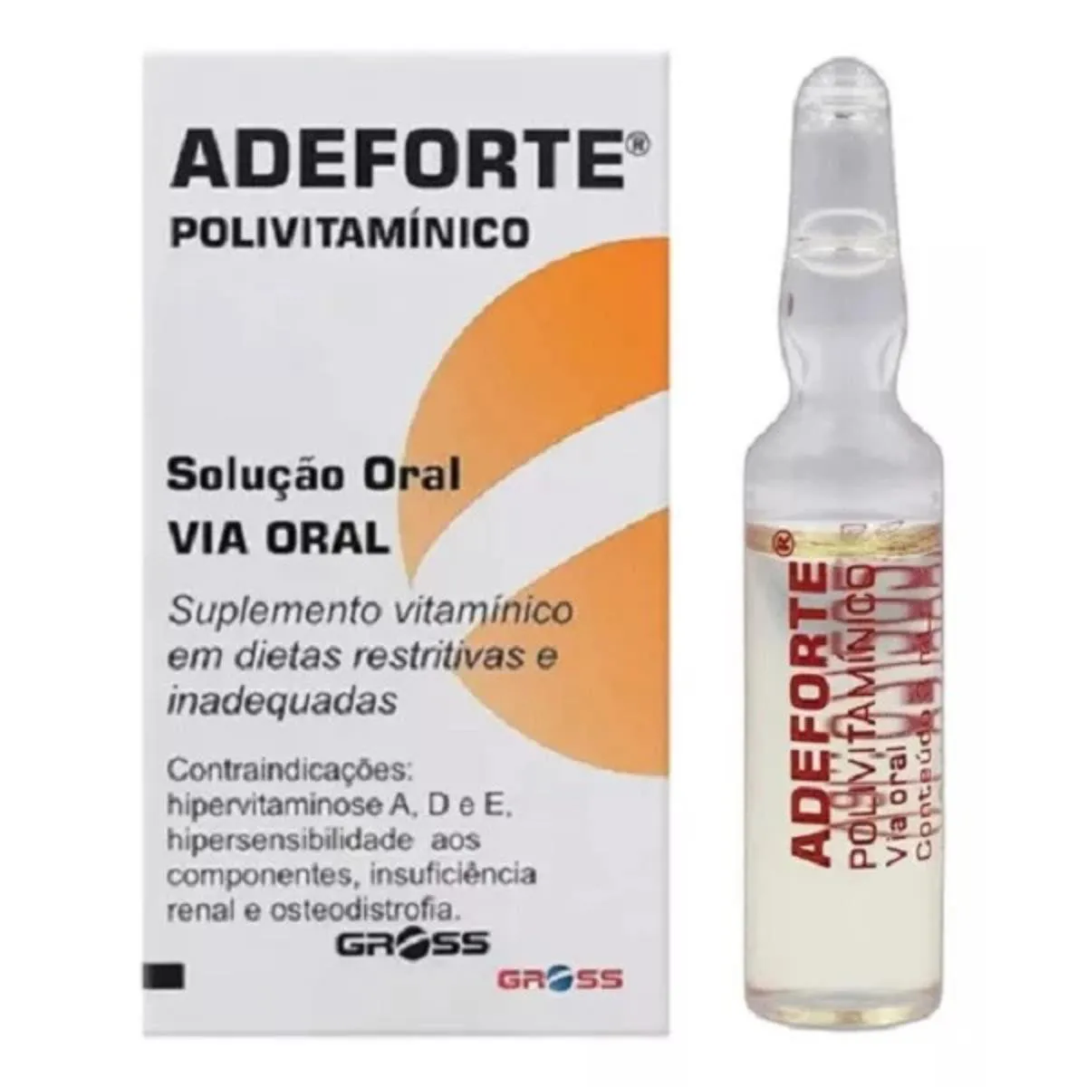 A Adeforte é uma solução oral em ampola de 3 mL, produzida pelo laboratório Gross, desenvolvida para a correção ou prevenção de deficiências das vitaminas A, D e E. Composição por ampola (3 mL):- vitamina a – 10.000 UI (na forma de palmitato de retinol)