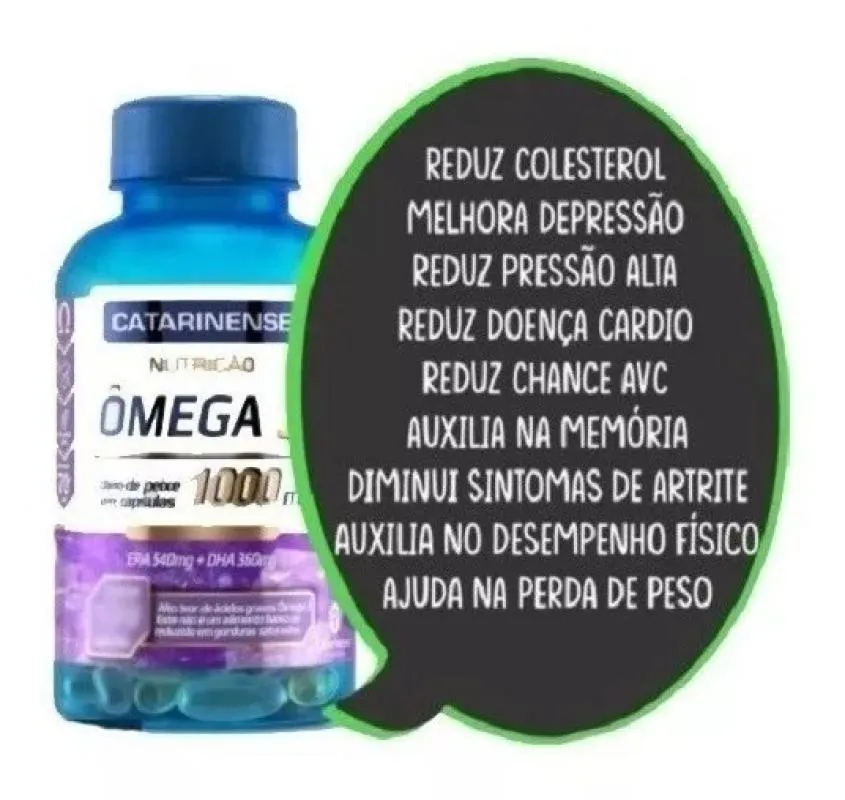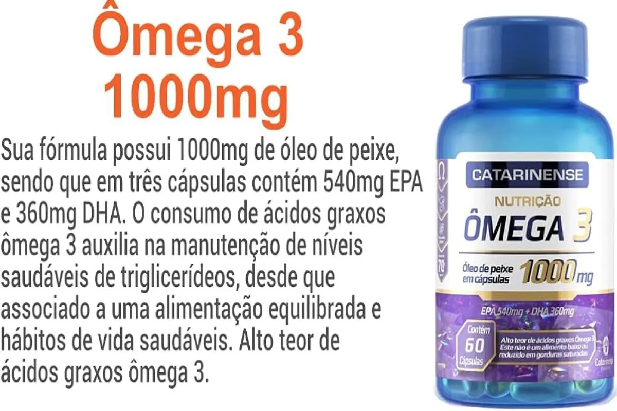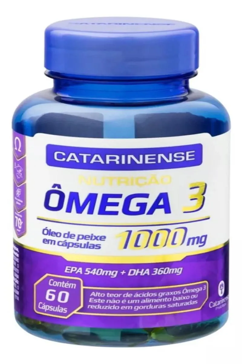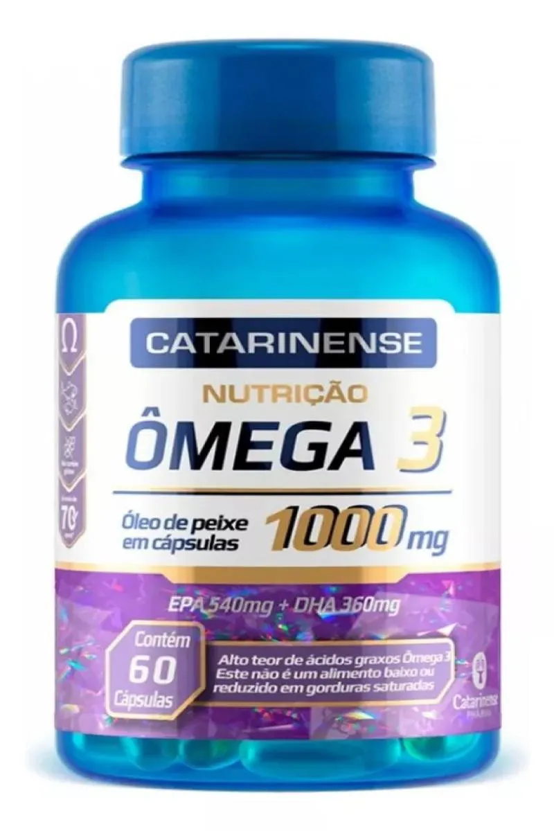 O Suplemento Alimentar Catarinense Ômega 3 Nutrição com 1000mg é à base de óleo de peixe, rico em EPA e DHA (também presente em vários alimentos como frutos-do-mar, nozes, sementes, óleos vegetais e produtos fortificados).
