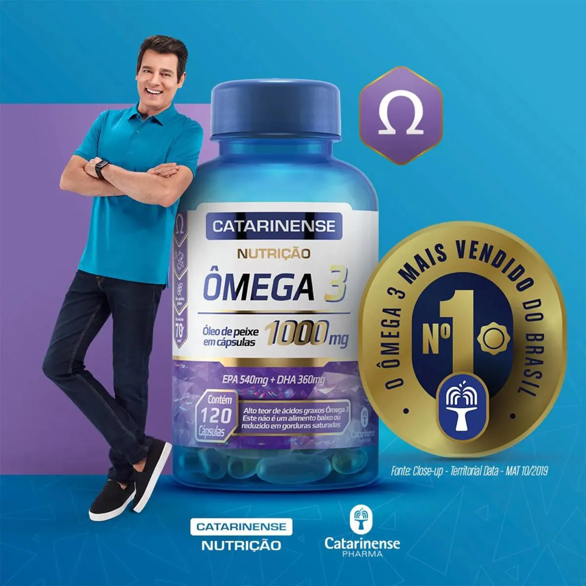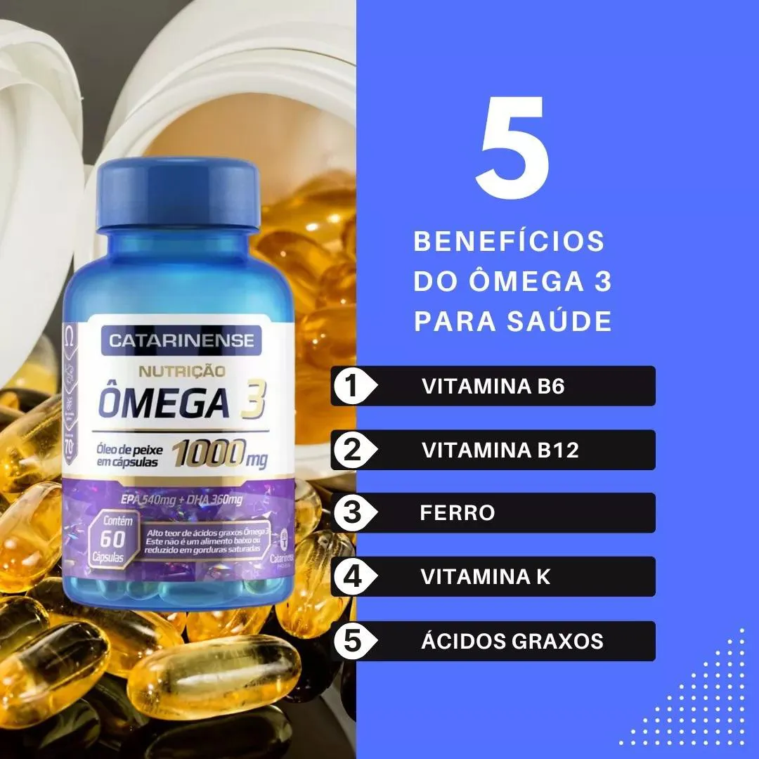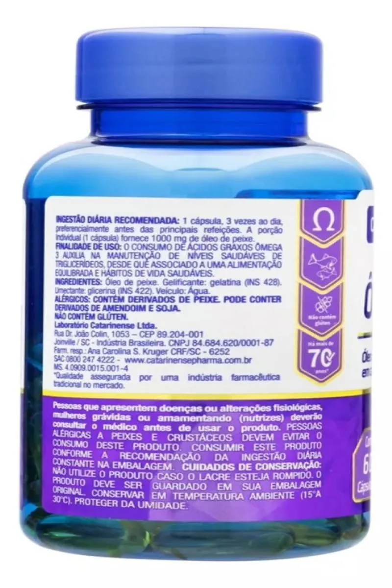 O Suplemento Alimentar Catarinense Ômega 3 Nutrição com 1000mg é à base de óleo de peixe, rico em EPA e DHA (também presente em vários alimentos como frutos-do-mar, nozes, sementes, óleos vegetais e produtos fortificados).