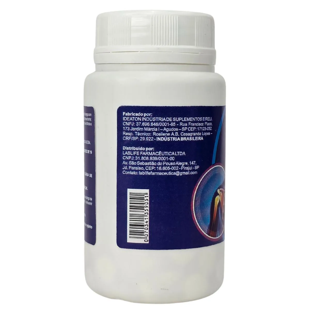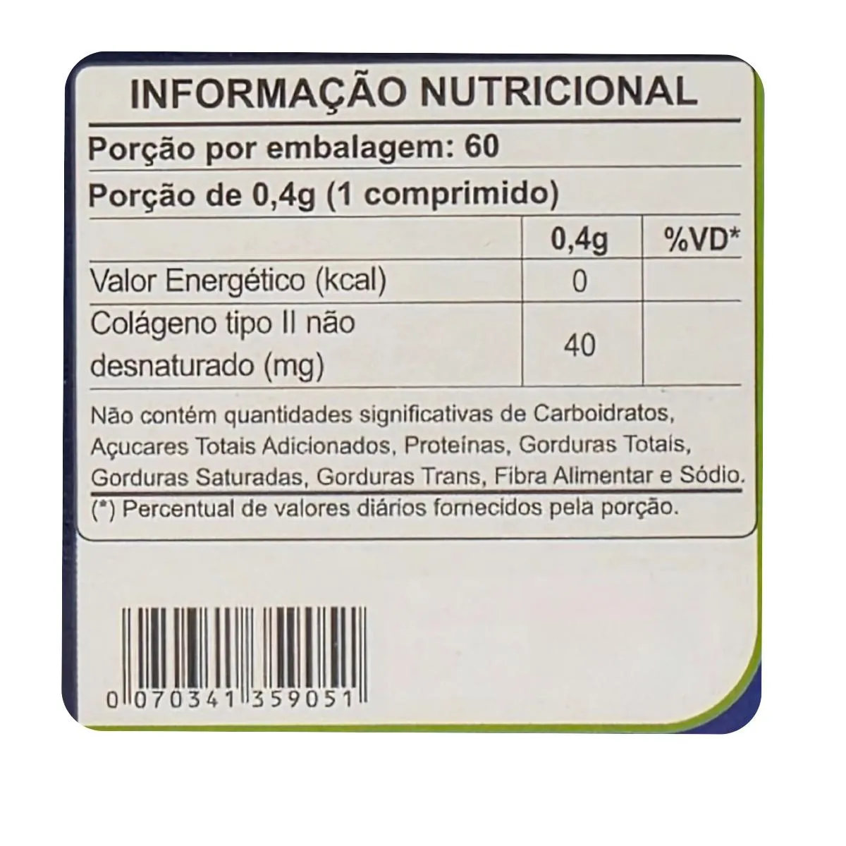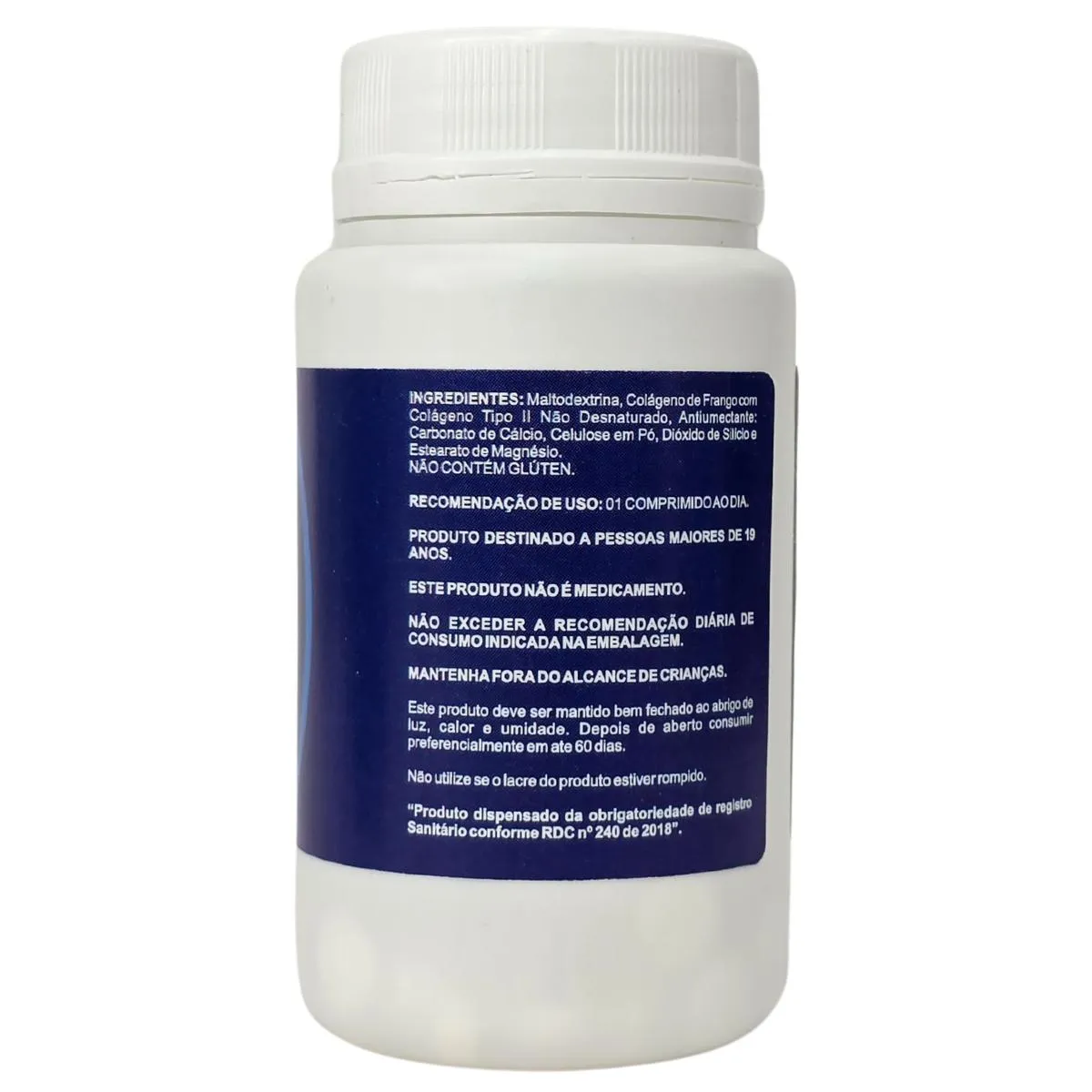Ingredientes: Maltodextrina, Colágeno de frango com colágeno Tipo II Não desnaturado, Antiumectante: Carbonato de cálcio, celulose em pó, dióxido de silício e estearato de magnésio.