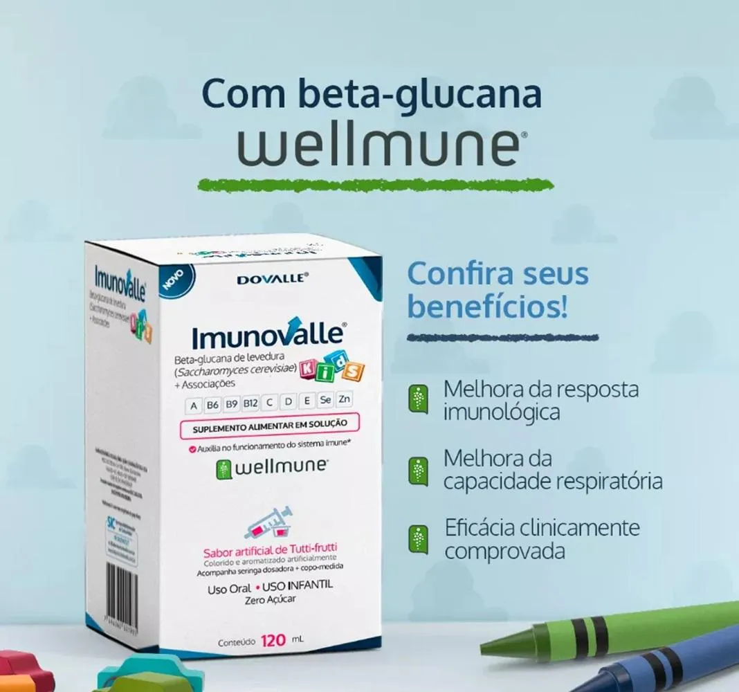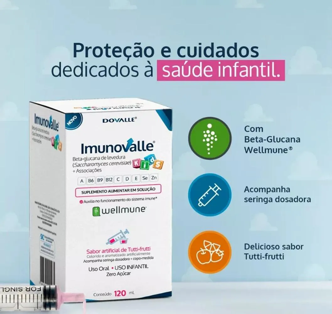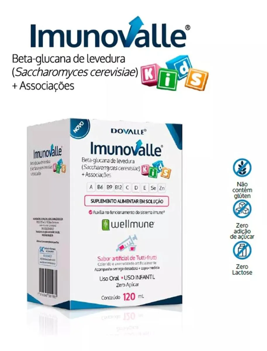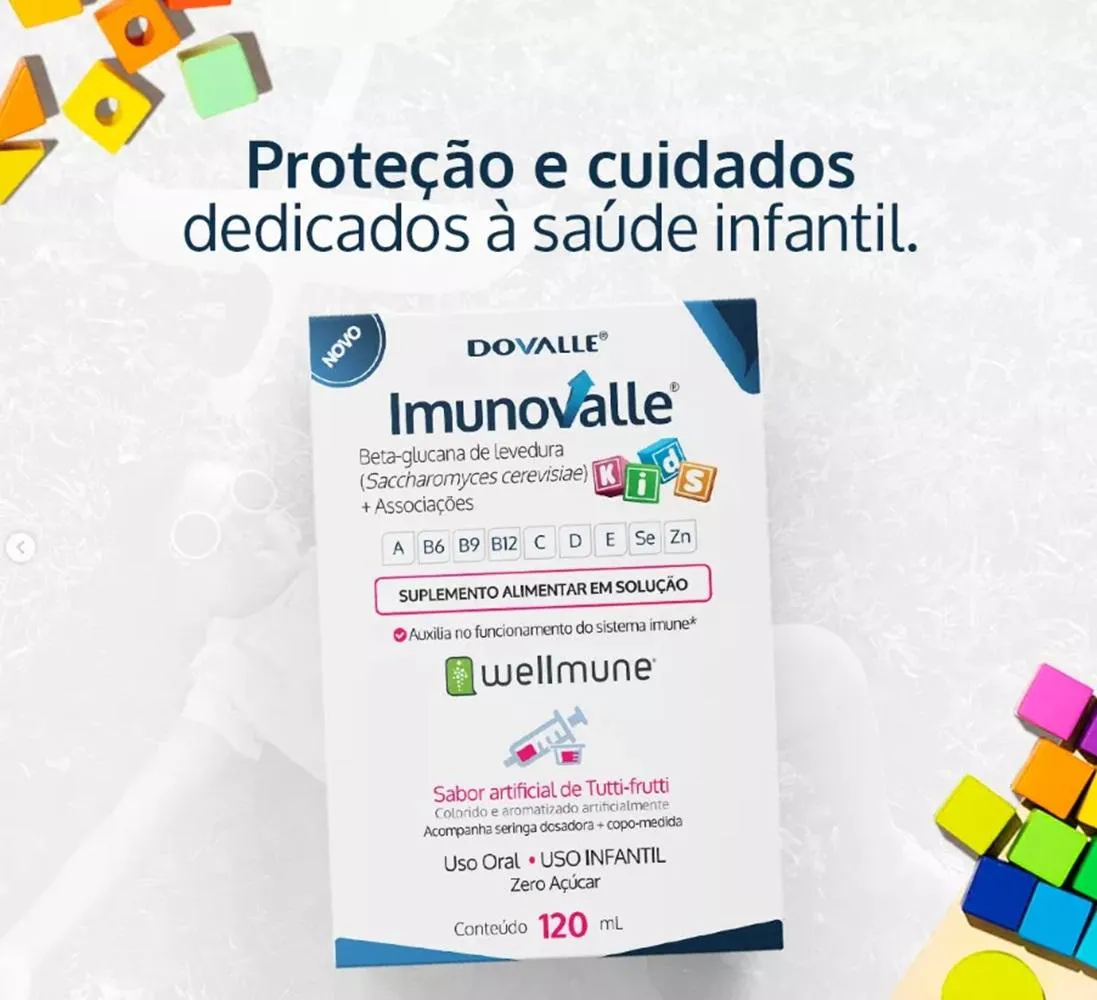 Imunovalle® Kids é um suplemento alimentar em solução, de uso infantil, à base de beta-glucana associada a vitaminas e minerais. Seu uso é indicado no funcionamento do sistema imune.