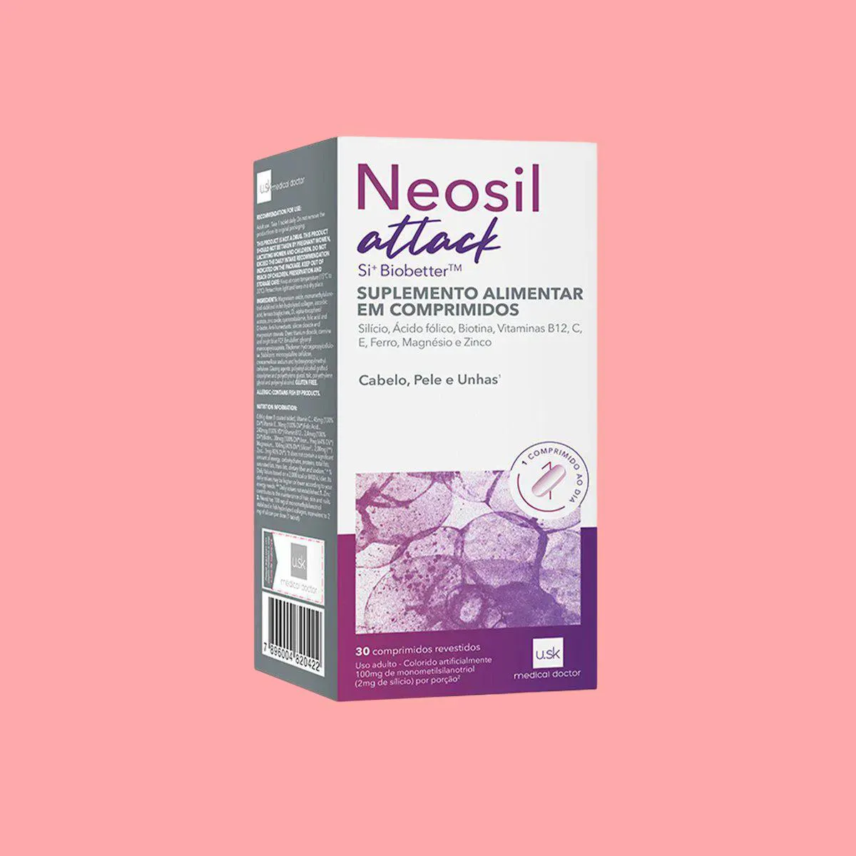 Uma nutrição equilibrada tem um papel muito importante na qualidade de vida. Com o ritmo acelerado de muitas pessoas, às vezes, é muito difícil prestar atenção a todos os requisitos que o corpo precisa para estar saudável e forte. Neste sentido, os suplementos cumprem a função de complementar a alimentação e ajudam a obter as vitaminas, minerais, proteínas e outros componentes indispensáveis para o correto funcionamento do organismo. Ingredientes: Óxido de magnésio, monometilsilanotriol estabilizado em colágeno hidrolisado de peixe, ácido ascórbico, bisglicinato ferroso, acetato de D-alfa tocoferol, óxido de zinco, cianocobalamina, ácido fólico, D-biotina, estabilizantes: celulose microcristalina, croscarmelose sódica, hidroxipropilmetilcelulose, corantes: dióxido de titânio, carmins, azul brilhante FCF, glaceantes: copolímero enxertado de álcool polivinilico (PVA) e polietilenoglicol (PEG), talco, polietilenoglicol e álcool polivinilico, antiumectantes: dióxido de silício, estearato de magnésio, espessante: hidroxipropiolcelulose, emulsificante: mono e diglicerídeos de ácidos graxos.