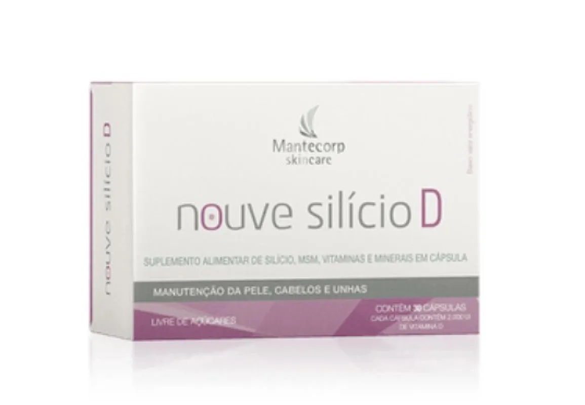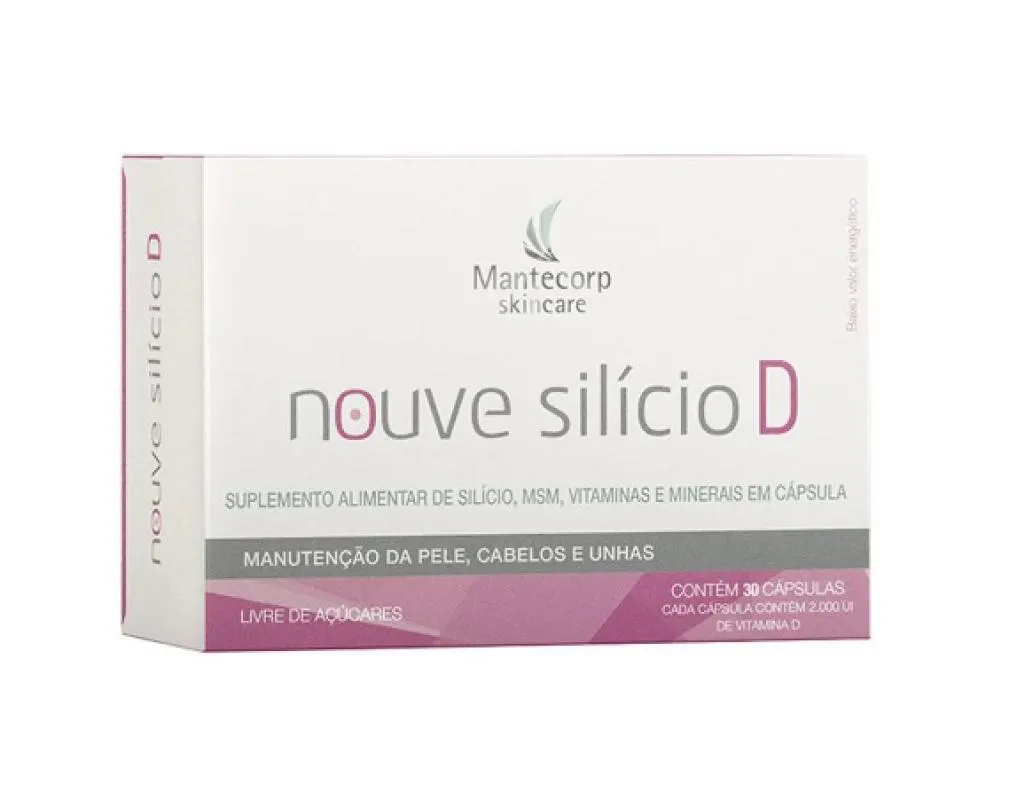 Nouve Silício D Nutracêutico para manutenção da pele, cabelos e unhas. Sua fórmula auxilia na melhora na saúde do cabelo, da pele e das unhas, a partir dos seus ativos composto por Silício Orgânico estabilizado em Colina, Biotina, vitamina d, Zinco, Selênio, vitaminas C, E, B3 e B6, Óleo de Borragem e MSM. Essa associação inteligente atua em sinergia, deixando cabelos e unhas mais fortes e a pele mais firme. Entre os seus benefícios estão a redução da queda capilar, fortalecimento dos fios e unhas, deixando-as menos quebradiças, ação antioxidante, estimulando o colágeno deixando a pele mais firme e hidratada. Além disso, é livre de açúcares, calorias e lactose, e não contém ingredientes de origem animal.