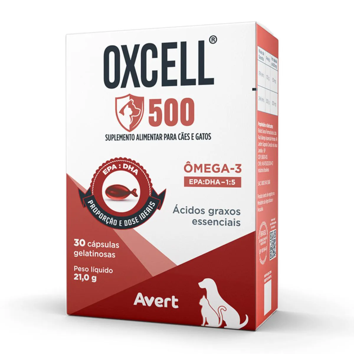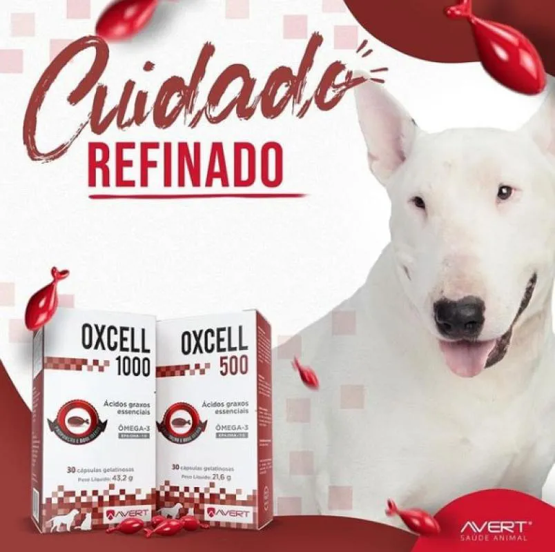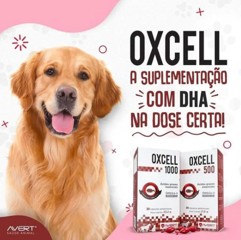 Suplemento Alimentar Oxcell 500 Ômega 3 para Cães e Gatos Com 30 Cápsulas Pet: Cães e gatos; Idade: Filhote, adulto e sênior; Benefícios: Promove a saúde cardiovascular, imunológica e nervosa; contém EPA e DHA na proporção de 1:5; Indicações: Ideal para cães e gatos de todas as idades que necessitam de aporte nutricional adicional; Apresentação: Cartucho com 30 cápsulas; Código de barras: 7898549750165. O Oxcell 500mg é um suplemento alimentar especialmente formulado para cães e gatos, enriquecido com ômega-3 — EPA e DHA, ácidos graxos essenciais que promovem uma saúde celular eficiente e suportam uma série de funções vitais nos pets. Derivado de peixes marinhos de águas frias, o Oxcell oferece elevada pureza e segurança, ideal para suprir as necessidades de cães e gatos com uma fórmula segura e eficaz. Os principais ácidos graxos presentes no ômega-3, o DHA e o EPA são especialmente benéficos para várias funções no organismo dos pets. Alguns dos principais benefícios são: Redução da Inflamação Saúde Cardiovascular Fortalecimento do Sistema Imunológico Saúde Cerebral e Função Cognitiva Pele Saudável e Pelage m Brilhante Apoio à Saúde Renal Melhora na Mobilidade e Conforto em Pets Idosos Regulação do Metabolismo Composição Carmim de cochonilha, óxido de ferro preto (corante), óxido de ferro vermelho (corante), água, glicerol, óleo de peixe refinado, gelatina e vermelho carmosina azorrubina (corante). Modo de usar Administrar a cápsula inteira ou o conteúdo da cápsula misturado ao alimento de acordo com a seguinte dose: 1 cápsula para cada 8 kg de peso corporal, por via oral, 1 vez ao dia.