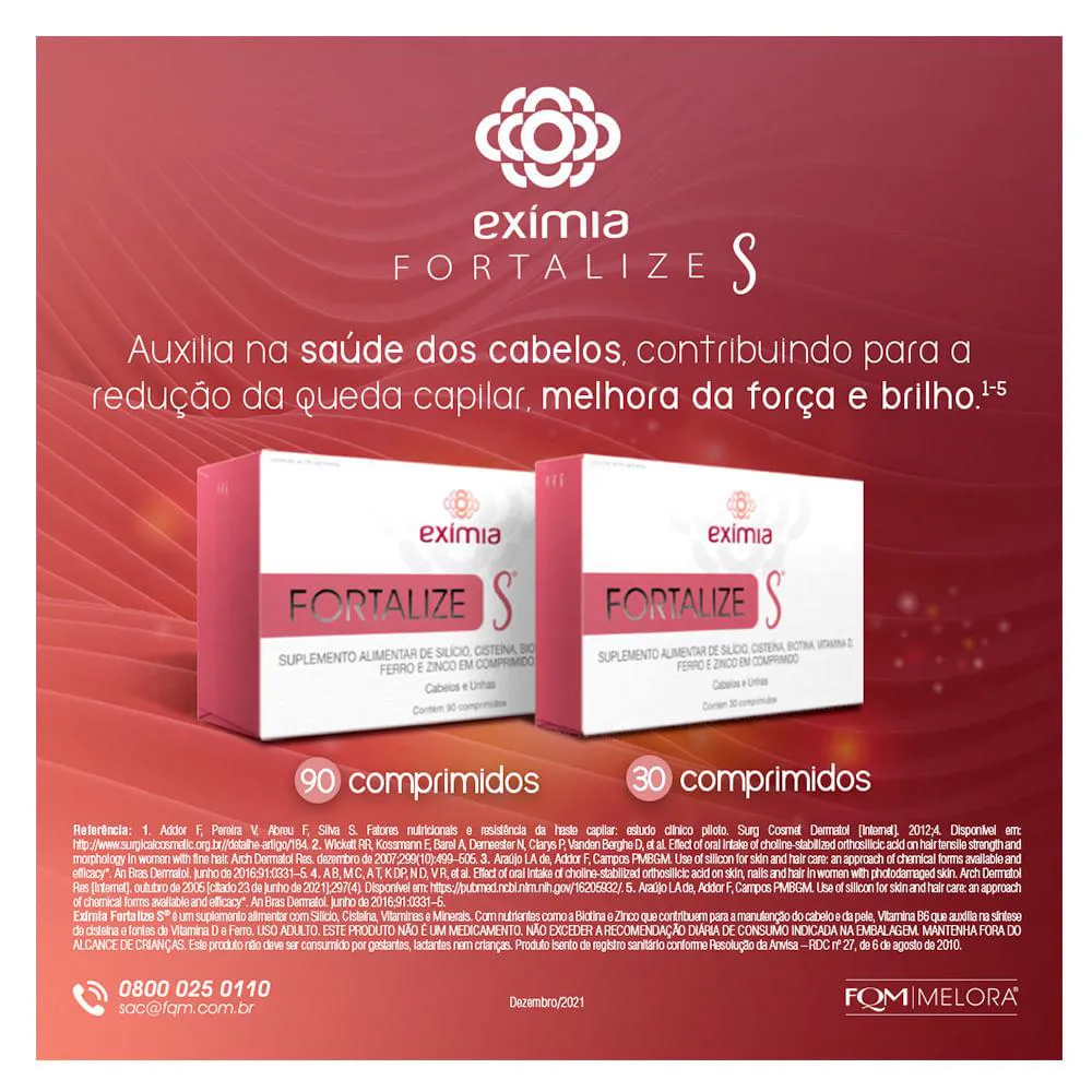 O Eximia Fortalize S é um suplemento alimentar com silicio, cisteina, ferro, zinco, biotina e vitamina d, somados a outras vitaminas e minerais que em sinergia auxiliam na redução da queda capilar e no crescimento de novos fios, deixando os cabelos mais fortes e brilhosos, alem de fortalecer as unhas.