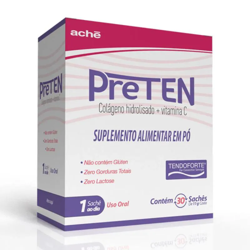 O Suplemento Alimentar Preten – 30 Sachês de 11g – Aché é uma formulação em pó que combina colágeno hidrolisado e vitamina c, desenvolvida para promover a saúde dos tendões, articulações e tecidos conjuntivos. Sua composição visa auxiliar na manutenção da integridade estrutural e funcional dessas estruturas, sendo especialmente indicado para adultos que buscam suporte nutricional para o sistema musculoesquelético. Composição por sachê (11g):- Colágeno hidrolisado