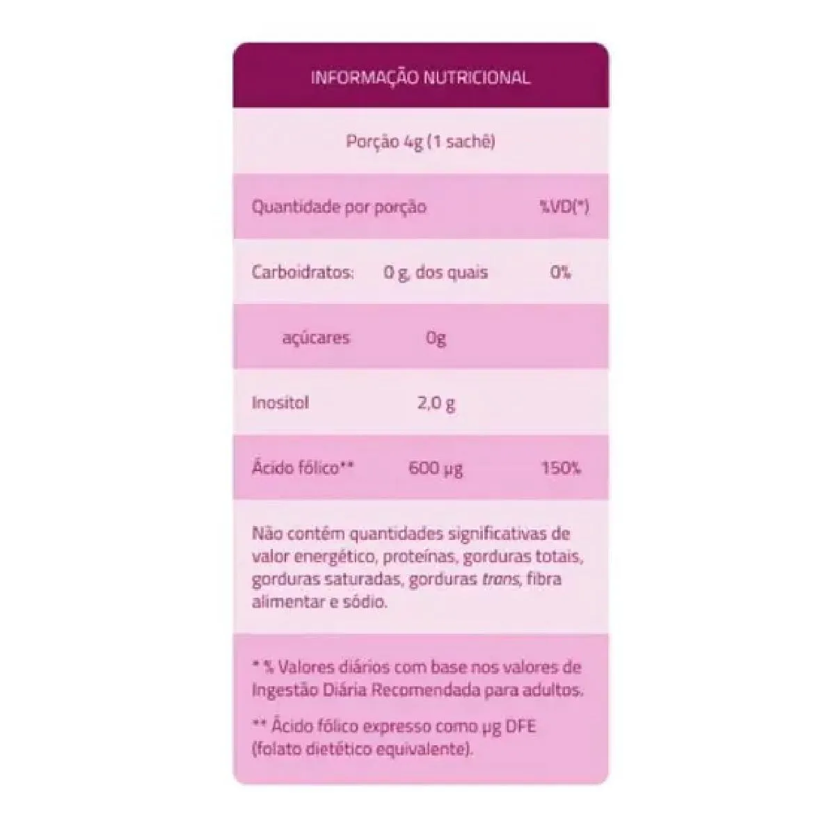 Uma nutrição equilibrada tem um papel muito importante na qualidade de vida. Com o ritmo acelerado de muitas pessoas, às vezes, é muito difícil prestar atenção a todos os requisitos que o corpo precisa para estar saudável e forte. Neste sentido, os suplementos cumprem a função de complementar a alimentação e ajudam a obter as vitaminas, minerais, proteínas e outros componentes indispensáveis para o correto funcionamento do organismo. Ingredientes: Mio-inositol, proteína de soro do leite concentrada*, ácido fólico, agente de massa isomalte, regulador de acidez carbonato de potássio, acidulante ácido cítrico e edulcorante sucralose. (*) fornece quantidade s não significativas de açúcares. Alérgicos: Contém derivados de leite e soja. Contém lactose. Não contém glúten.