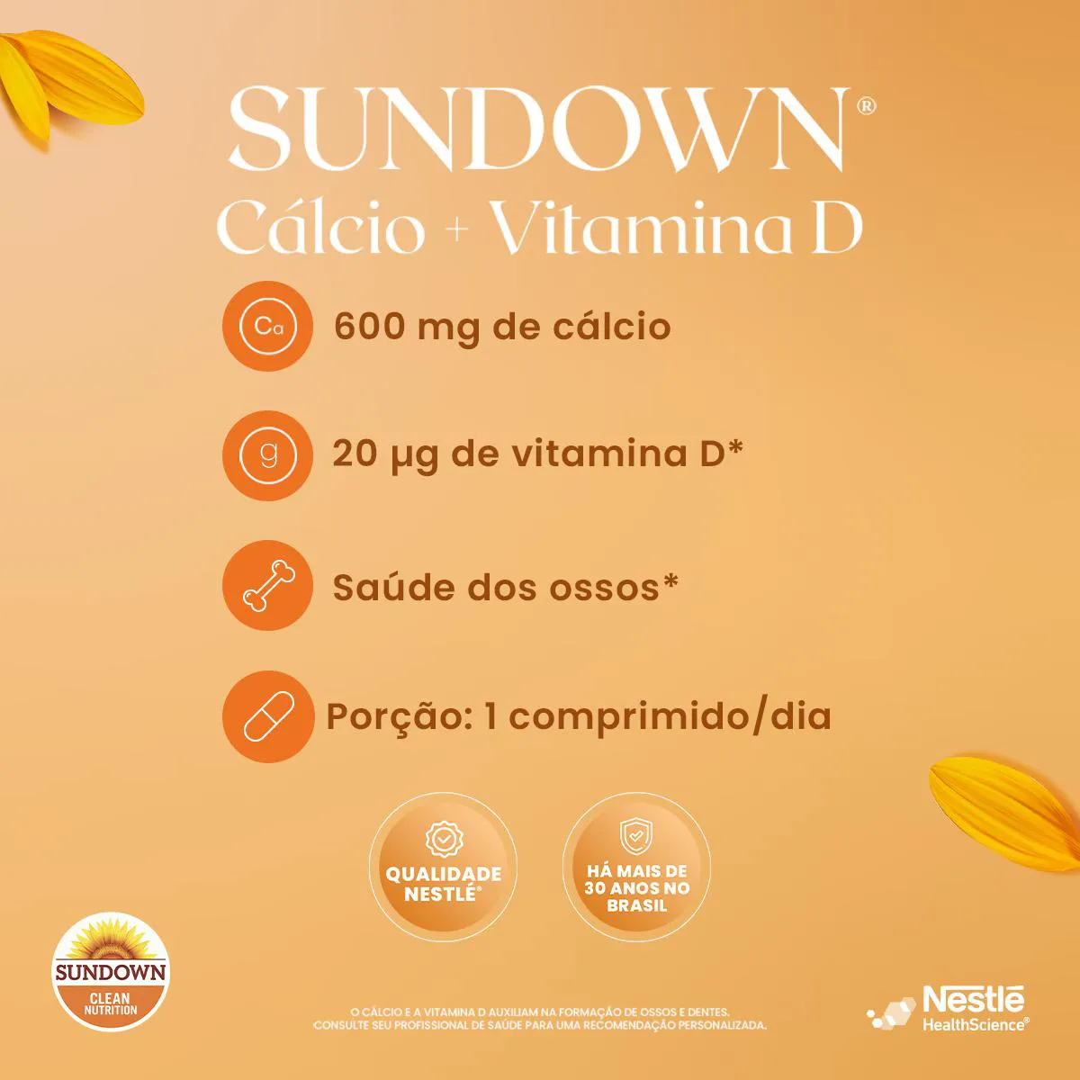 Suplemento alimentar em comprimidos com 600mg de cálcio e 800UI de vitamina d por porção, que auxiliam na manutenção da saúde óssea e na formação de ossos e dentes.