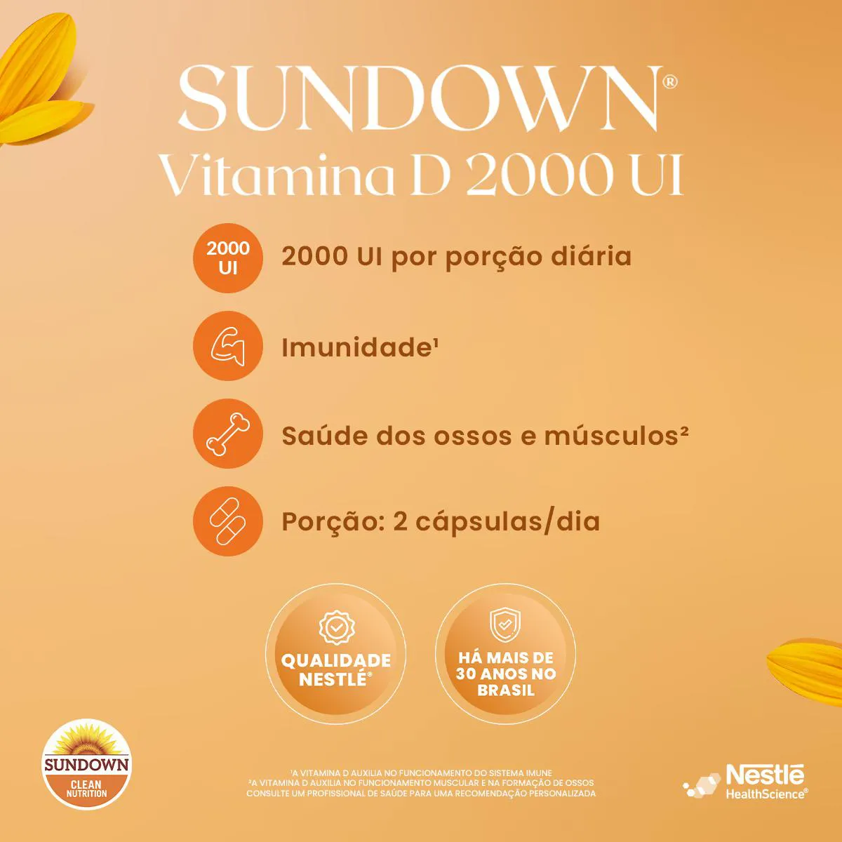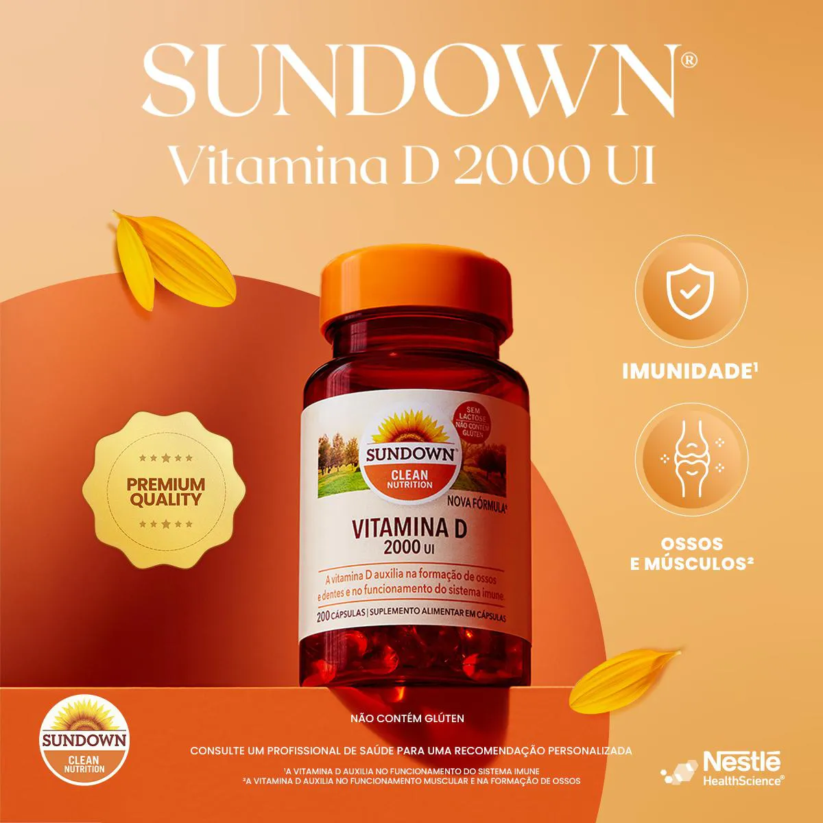 Suplemento alimentar em cápsulas com 2.000UI de vitamina d por porção, que auxilia na formação de ossos e dentes, além de contribuir para o funcionamento do sistema imunológico, promovendo uma saúde equilibrada e fortalecida.