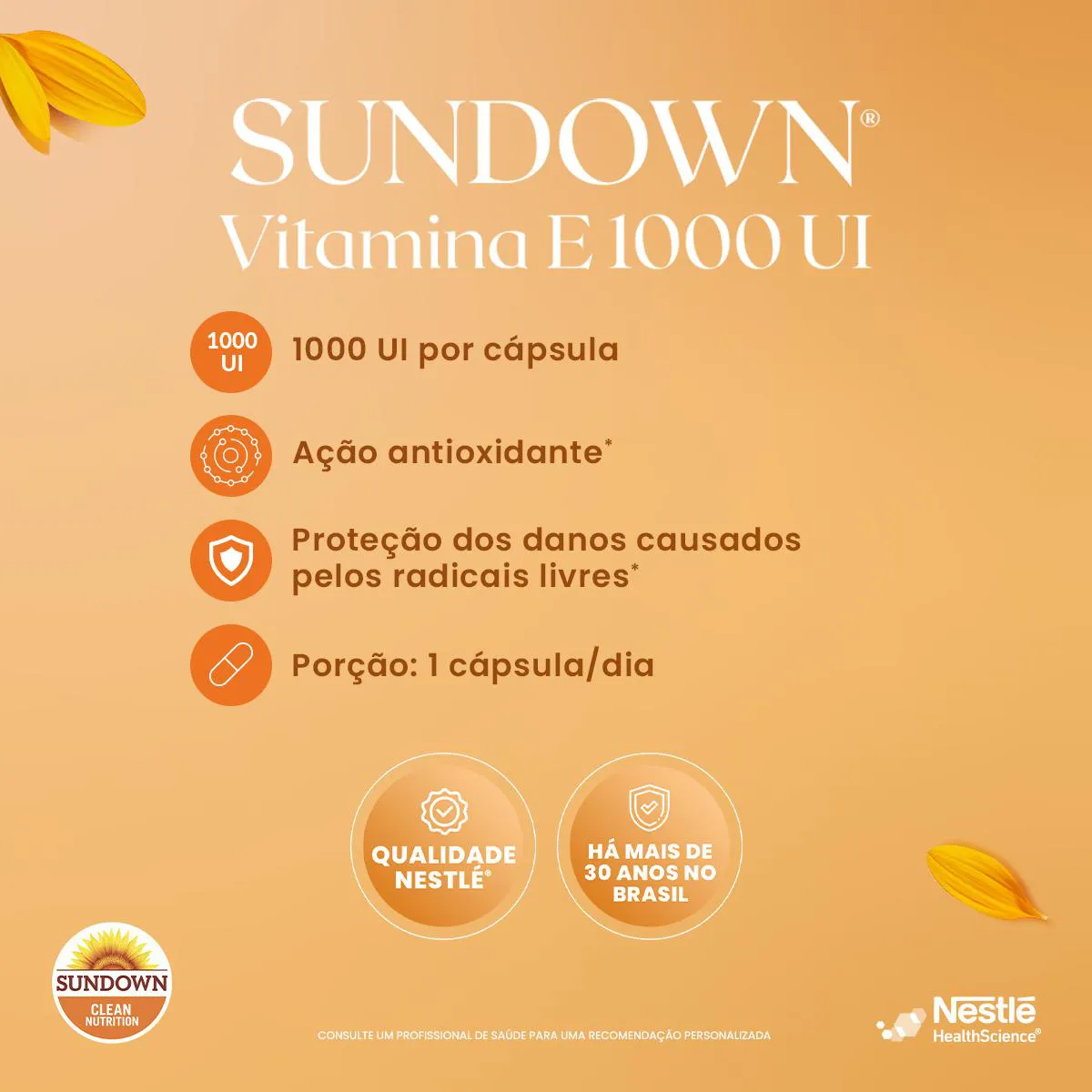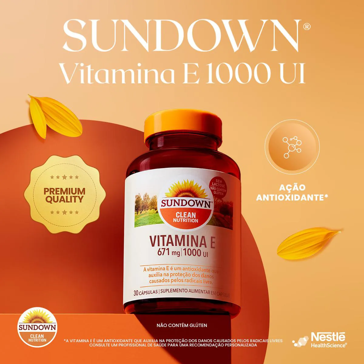 Suplemento alimentar em cápsulas com 1.000UI por porção, que possuiação antioxidante que auxilia na proteção dos danos causados pelos radicais livres, contribuindo para o bem-estar geral.