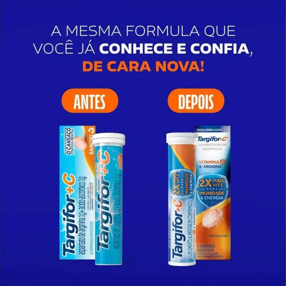 Targifor C + Arginina é um suplemento alimentar de vitamina c e aspartato de Arginina que ajuda a fortalecer a imunidade e auxilia na manutenção do metabolismo energético com ação antioxidante. E agora está de cara nova: uma nova embalagem para o seu aliado no reforço da imunidade e energia. Com 2 vezes mais vitamina C para imunidade e energia, Targifor C está disponível na versão de 16 comprimidos efervescentes, cada um com 1g de vitamina C (ácido ascórbico) e 1g de aspartato de arginina.