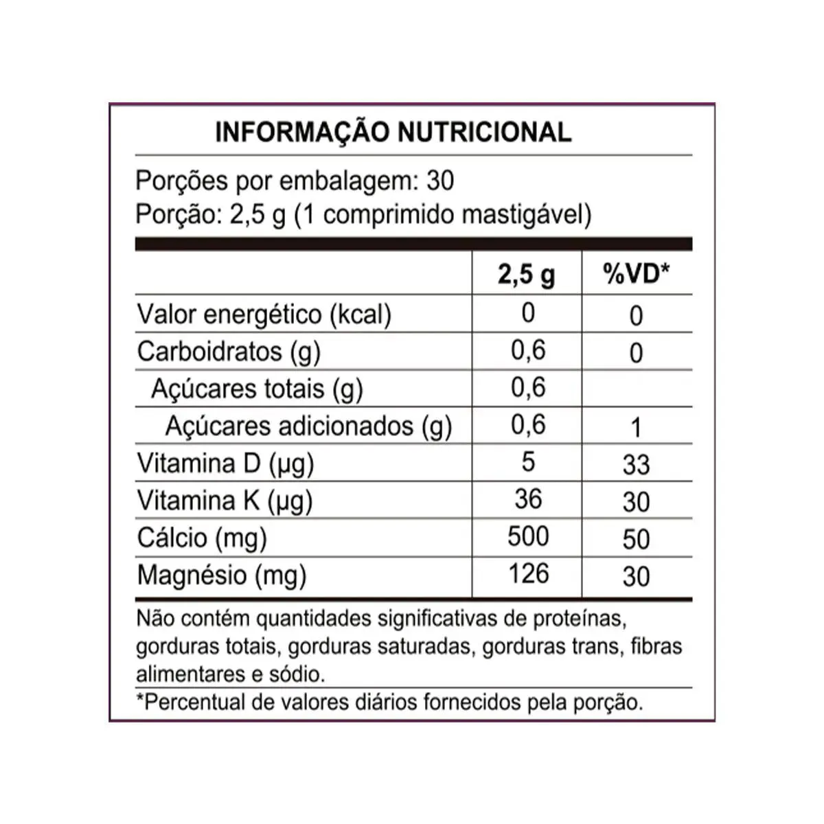 Composição: carbonato de cálcio, dextrose*, óxido de magnésio, menaquinona-7 e vitamina D3 (colecalciferol). Agente de massa: celulose microcristalina. Antiumectante: dióxido de silício e estearato de magnésio. Aromatizante. Edulcorante: sucralose e acesulfame de potássio. (*) fornece quantidades não significativas de açucares. NÃO CONTÉM GLÚTEN.