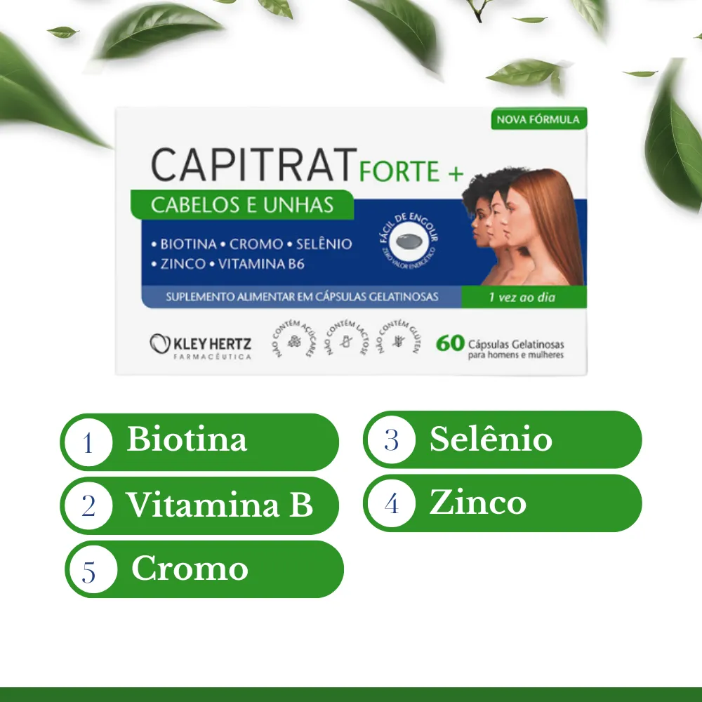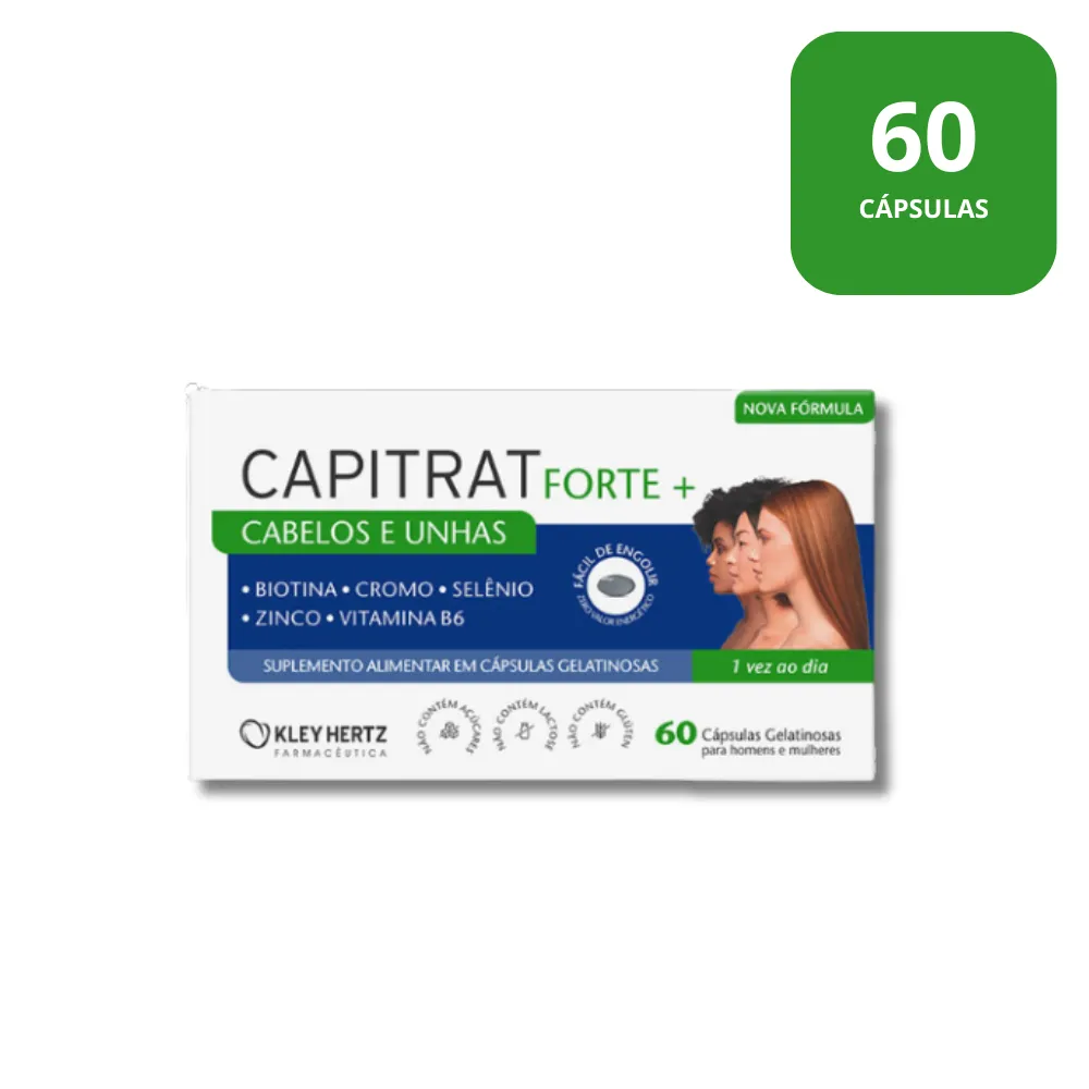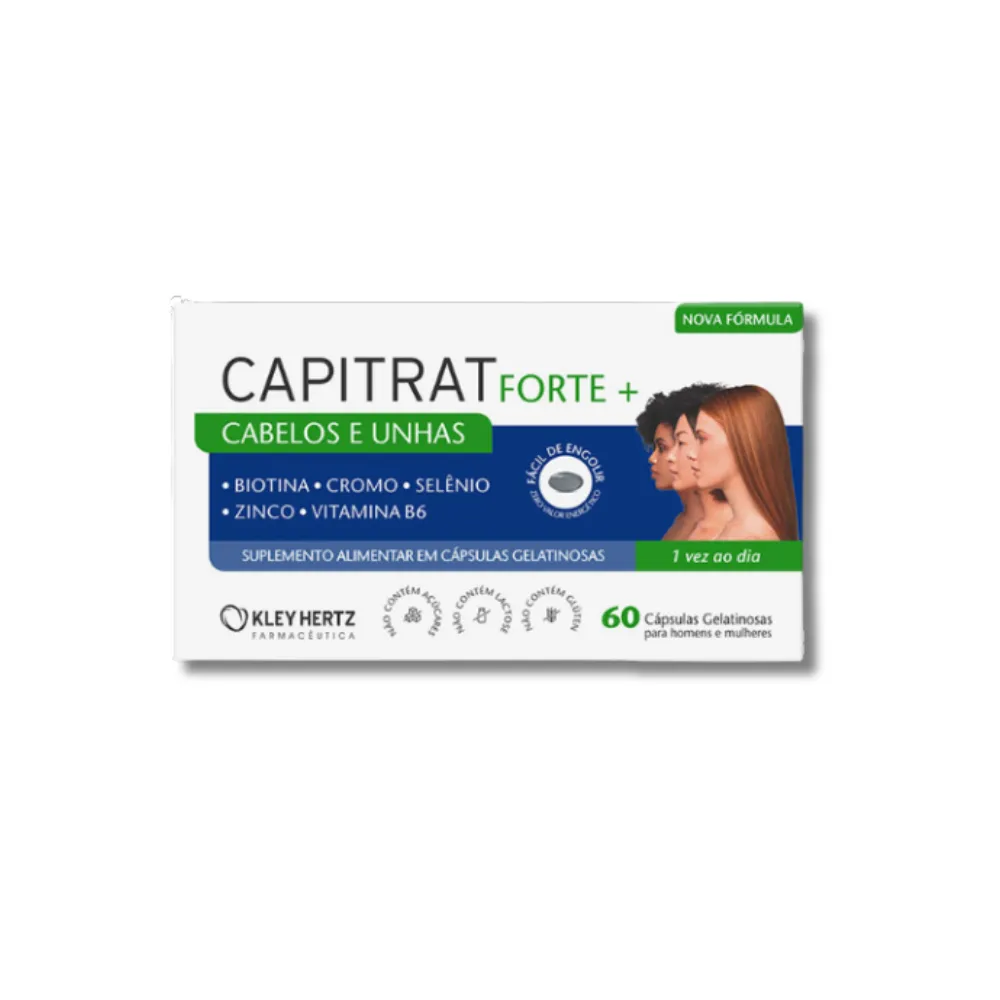 O Capitrat Forte+ Cabelos e Unhas é um suplemento alimentar especialmente formulado para promover a saúde e a beleza dos cabelos e das unhas. Rico em nutrientes essenciais, este suplemento é uma fonte concentrada de vitamina B6, biotina (vitamina H), cromo, selênio e zinco, fornecendo 100% da recomendação diária em apenas uma porção.