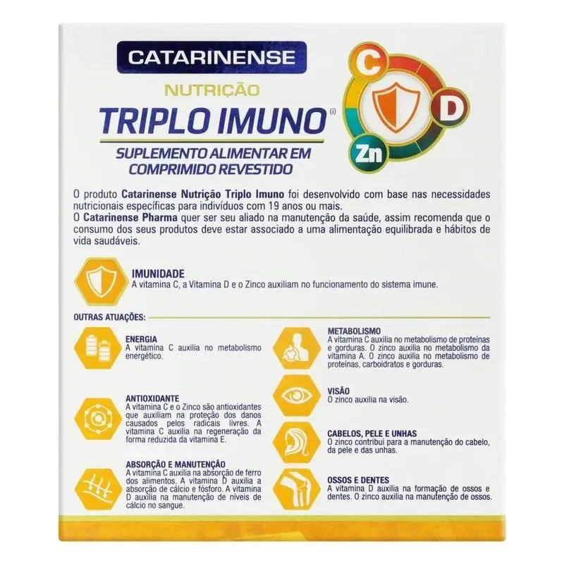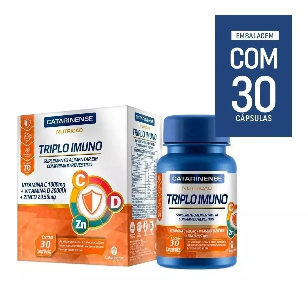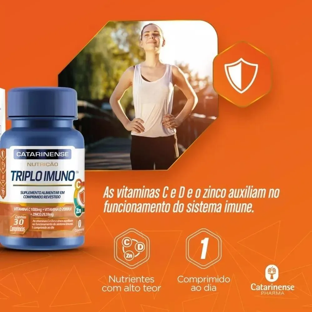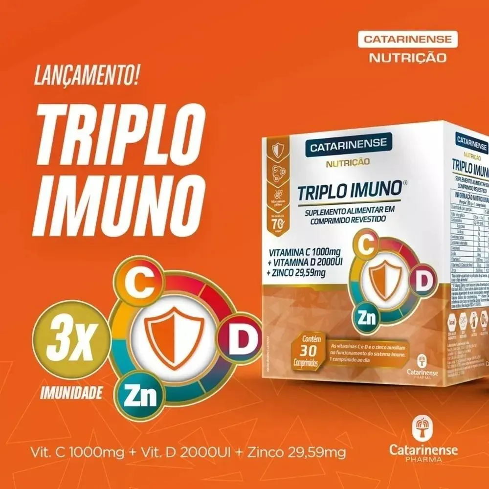 O Suplemento Catarinense Triplo Imuno é um suplemento alimentar composto por Vitamina C, vitamina d e Zinco, desenvolvido para complementar a nutrição e oferecer uma fórmula balanceada de vitaminas e minerais. Serve para auxiliar no funcionamento correto do organismo, prevenir deficiências alimentares causadas por patologias ou circunstâncias específicas, e colaborar com a saúde e o bem-estar geral, especialmente para pessoas com ritmo de vida acelerado que necessitam de apoio nutricional.