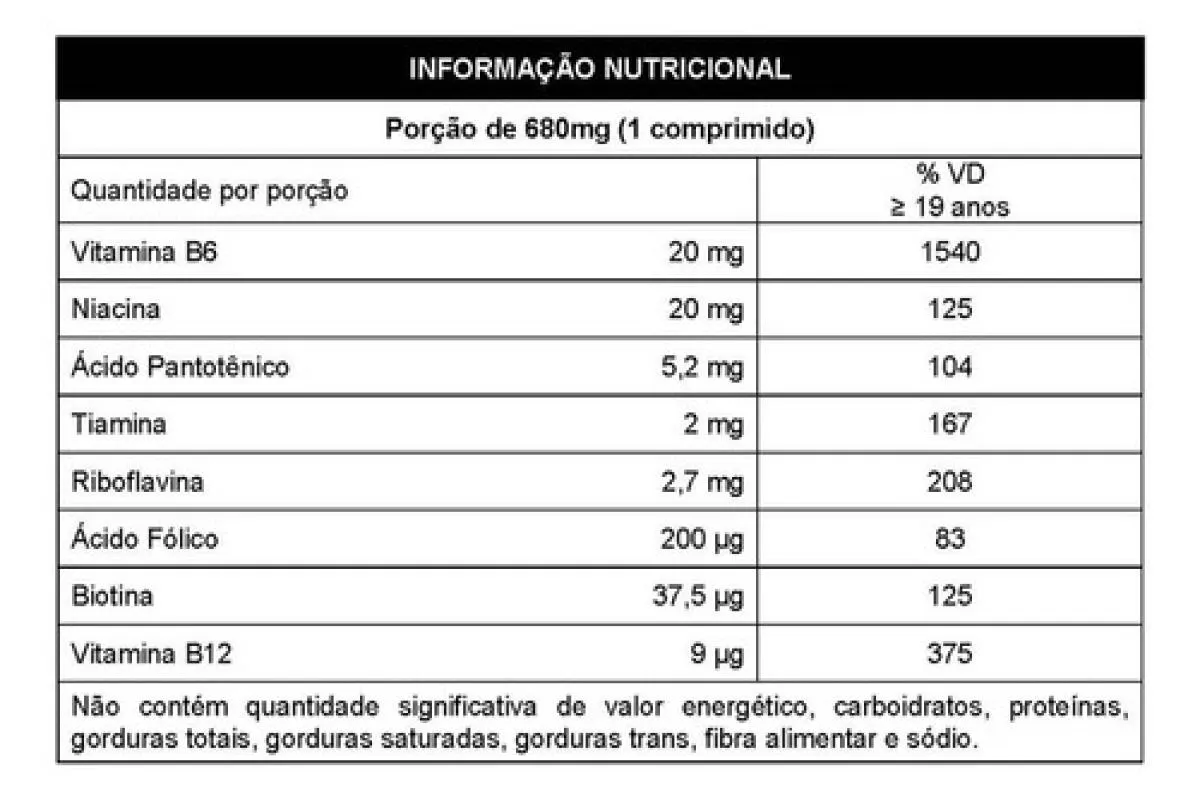 INGREDIENTES: Cloridrato de Piridoxina (Vitamina B6), Niacinamida (Niacina), D-Pantotenato de Cálcio (Ácido Pantotênico), Tiamina Mononitrato (Vitamina B1), Riboflavina (Vitamina B2), Ácido Fólico (Vitamina B9), D-Biotina (Biotina), Cianocobalamina (Vitamina B12), agentes de massa: Celulose Microcristalina (INS 460i), glaceantes: Hidroxipropilmetilcelulose (INS 464), Etilcelulose (INS 462), talco (INS 553iii), Polietileno Glicol (INS 1521), umectante: Triacetina (INS 1518), estabilizante: Croscarmelose Sódica (INS 468), antiumectante: Dióxido de Silício (INS 551), antiaglutinante: Estearato de Magnésio (INS 470iii), corantes: Dióxido de Titânio (INS 171), Corante Tartrazina (INS 102), Corante Amarelo Crepúsculo (INS 110).
