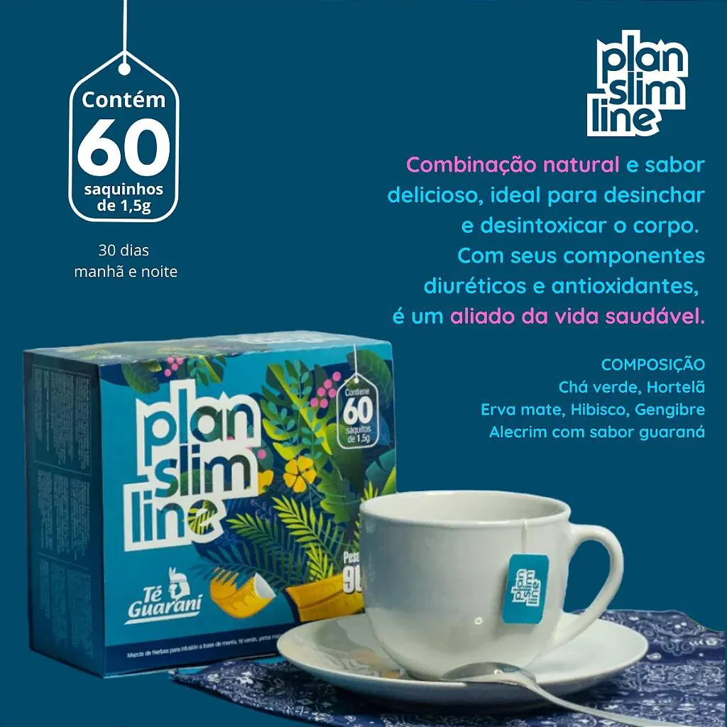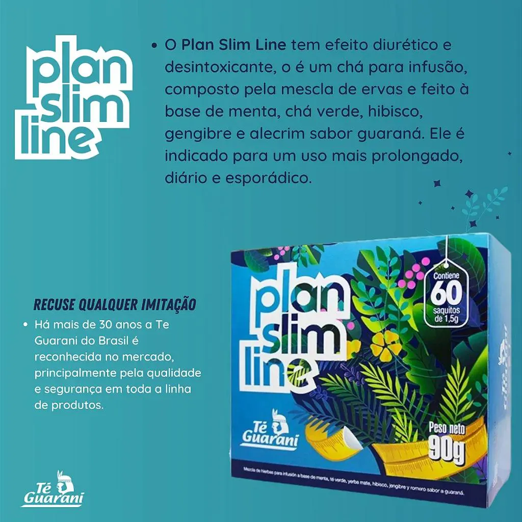 é um aliado da vida saudável. O Chá Plan Slim Line usa somente ervas naturais, nada de sabor artificial: Chá verde, Hortelã, Erva mate, Hibisco, Gengibre, Alecrim com sabor guaraná. É zero calorias, sem glúten e sem lactose (e com muito sabor!). O Chá Plan Slim Line pode ser consumido de 1 a 3 sachês por dia, no horário da sua preferência. Recomendamos logo pela manhã, e pouco antes de dormir. Recomendamos que gestantes, lactantes e pessoas em condições específicas de saúde conversem com um nutricionista para garantir que o consumo seja seguro considerando a sua individualidade biológica. Para preparar o seu Chá Plan Slim Line, basta fazer a infusão de 1 sachê em 200 ml de água quente e esperar de 3 a 5 minutinhos! Se preferir tomar gelado, basta fazer a infusão em água quente da mesma forma, e adicionar gelo a gosto! Você também pode mantê-lo na geladeira por até 24 horas. PRODUTO GO6270 EAN 7840127020580 QUANTIDADE 60 Sachês FABRICANTE Té Guarani MARCA Plan Slim Line