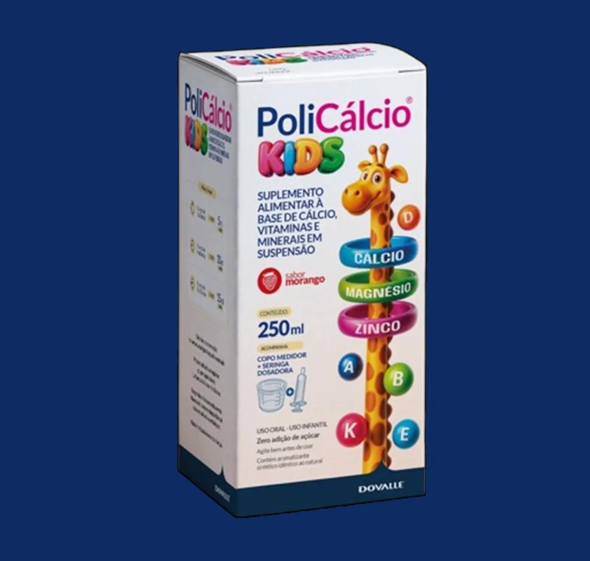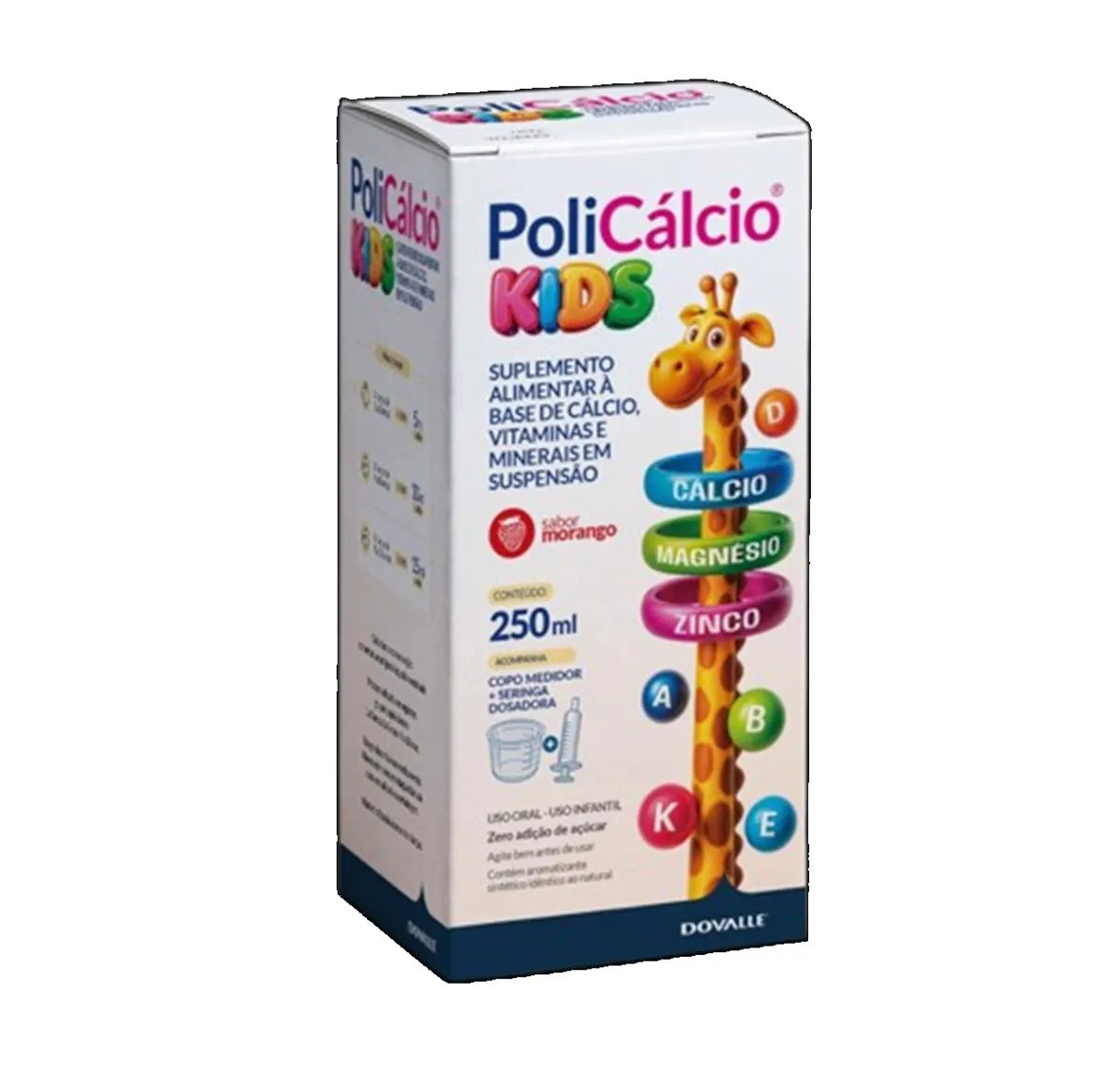 Suplemento PoliCálcio Kids 250ml - Dovalle O PoliCálcio Kids é um suplemento infantil em suspensão oral, com sabor morango e fórmula que combina cálcio, magnésio, zinco e vitaminas A, B, D, E e K. Livre de glúten, lactose e adição de açúcar, é uma opção prática para complementar a ingestão diária de nutrientes essenciais. Embalagem de 250 ml. Imagens Meramente Ilustrativas. Todas as Informações Divulgadas são de Responsabilidade Exclusiva do Fabricante/fornecedor.