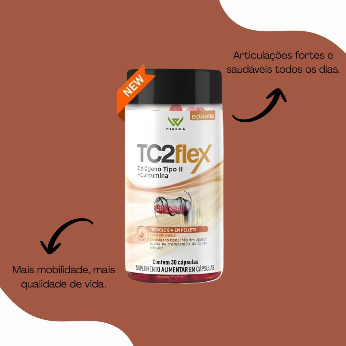 Fortaleça suas articulações com TC2 Flex Prowin. Fórmula com colágeno tipo II não desnaturado (UC-II®), vitaminas e minerais selecionados para auxiliar na manutenção da cartilagem, mobilidade e conforto articular — ideal para quem pratica atividades físicas ou busca bem-estar no dia a dia.