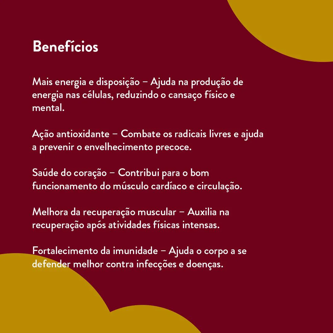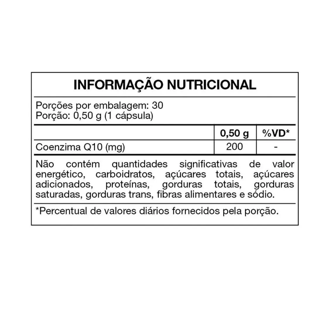 - Ingrediente ativo: Ubiquinona (Coenzima Q10) – 200 mg por cápsula