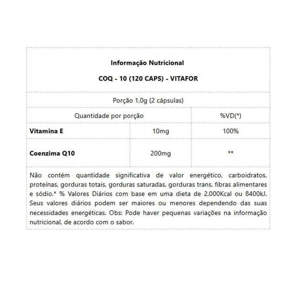 Coenzima Q10 (120 caps) A Coenzima Q10 (CoQ-10) da Vitafor é um suplemento alimentar em cápsulas, que possui 200 mg de Coenzima Q10. Contém como veículo em sua formulação TCM (triglicérides de Cadeia média). É enriquecido com vitamina e (D-L-Alfa Tocoferol) e possui corante natural de urucum. A vitamina E é um antioxidante que auxilia na proteção dos danos cas pelos radicais livres. A Coenzima Q10, também denominada Ubidecarenona, é uma benzoquinona presente em praticamente todas as células do organismo e que participa dos processos de produção de ATP (célula enérgetica). Por ser essencial nesse processo, órgãos com maior demanda energética como o coração, o cérebro, rins e fígado, apresentam maiores concentrações de CoQ10. BENEFÍCIOS * 200mg de Coenzima Q10, por porção;* Com Vitamina E;* Antioxidante potente;* Melhora a qualidade de vida na melhor idade;* Melhora o índice glicêmico;* Neuroprotetor;* Reduz o risco de lesão muscular em atletas. Embalagem disponível: pote contendo 120 cápsulas de suplemento.