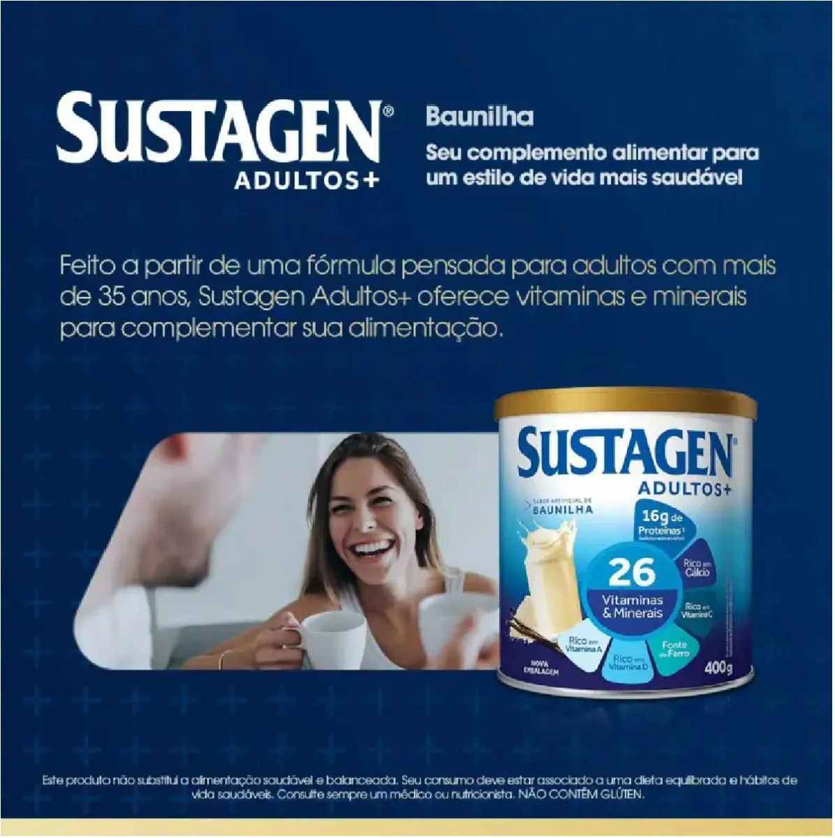 O Complemento Alimentar Sustagen Adulto Sabor Baunilha é um complemento alimentar para adultos. Sua fórmula contém 26 vitaminas e minerais, como cálcio, ferro, vitamina d e proteína.