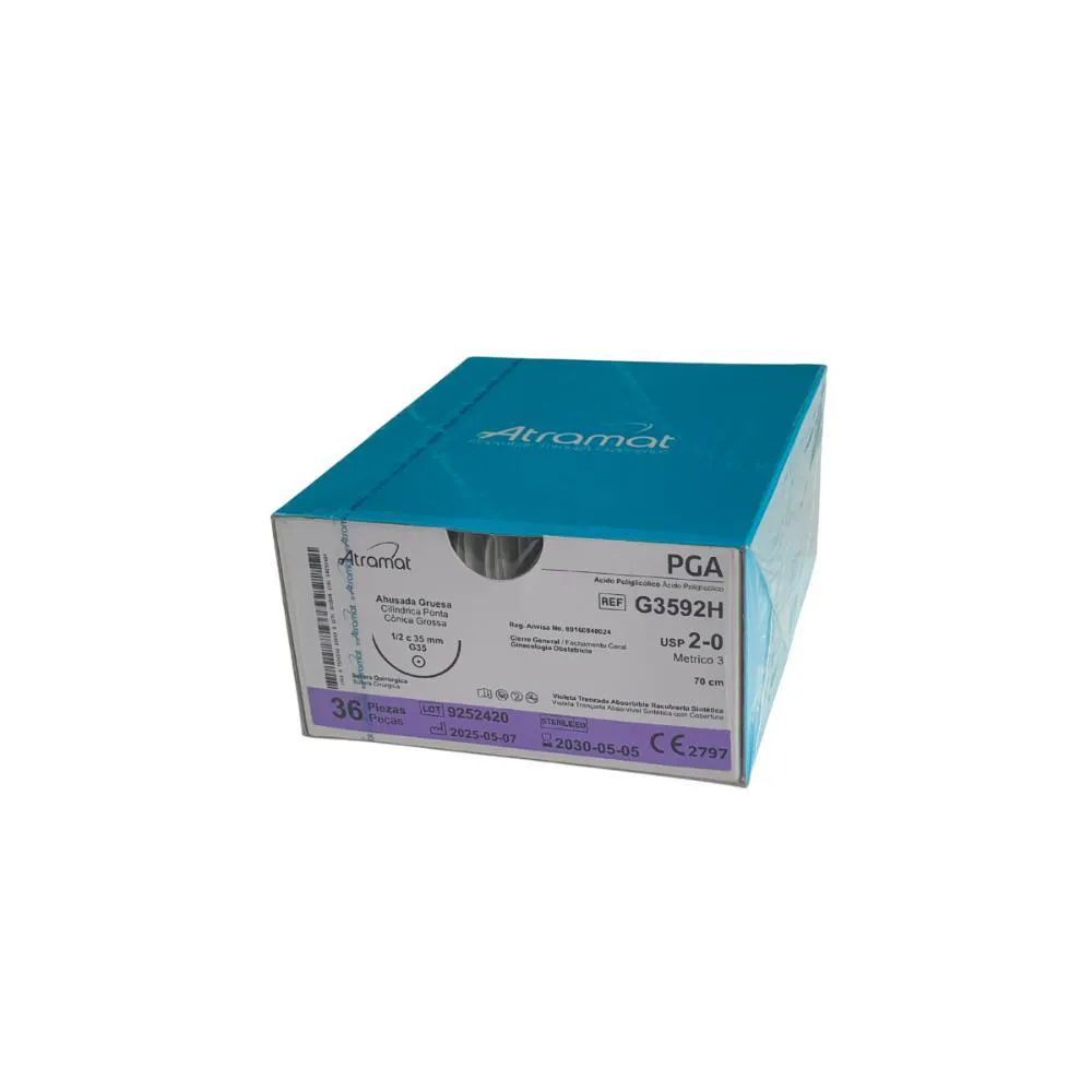 Fio de Sutura Ácido Poliglicólico Violeta 2-0 70 cm Agulha Cilíndrica Ponta Cônica Grossa 35 mm 1/2 Circ – Atramat