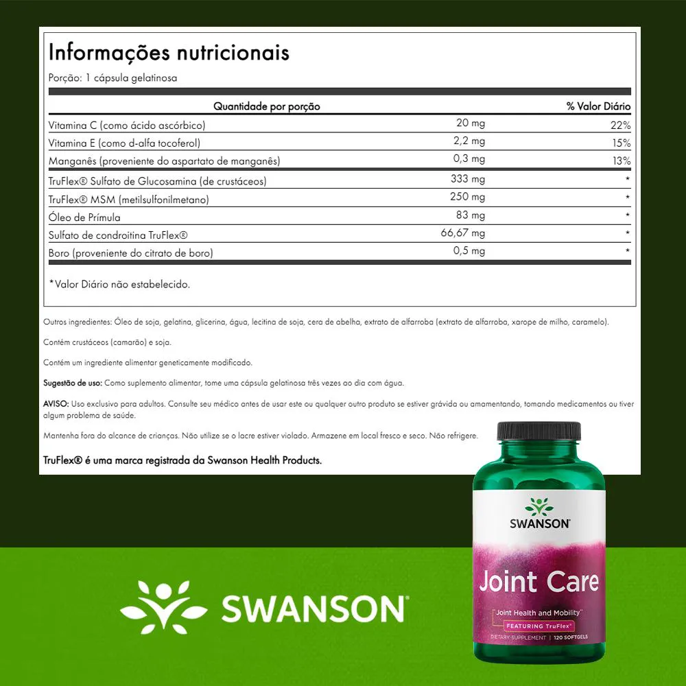 Swanson Joint Care Truflex 120 Sgels Suplemento Articular1. O que é este suplementoEste suplemento Joint Care Truflex em softgels é formulado como um complexo nutricional para complementar a rotina alimentar diária. Uma excelente opção de suplementação para quem busca suplemento articular em cápsulas e uso contínuo organizado.2. Por que escolher este produtoReúne uma fórmula combinada Truflex em softgels, facilitando o consumo sem a necessidade de múltiplos suplementos. Uma excelente opção de suplementação para quem procura Joint Care cápsulas, fórmula combinada e praticidade no dia a dia.3. Aplicação na rotina diáriaEste suplemento alimentar pode ser facilmente incluído no uso diário, atendendo diferentes perfis de consumo. Uma excelente opção de suplementação para quem valoriza constância, organização e rotina alimentar estruturada, sem promessas específicas.4. Formato e composiçãoApresentado em softgels, formato valorizado por facilitar a ingestão e o controle do consumo. A composição como complexo Truflex atende buscas por suplemento em softgels, joint care suplemento e uso contínuo.5. Quantidade e rendimentoFrasco com 120 softgels, ideal para quem busca maior rendimento e acompanhamento prolongado da rotina. Uma excelente opção de suplementação para quem procura suplemento 120 cápsulas, embalagem econômica e controle diário do consumo. Validade longa