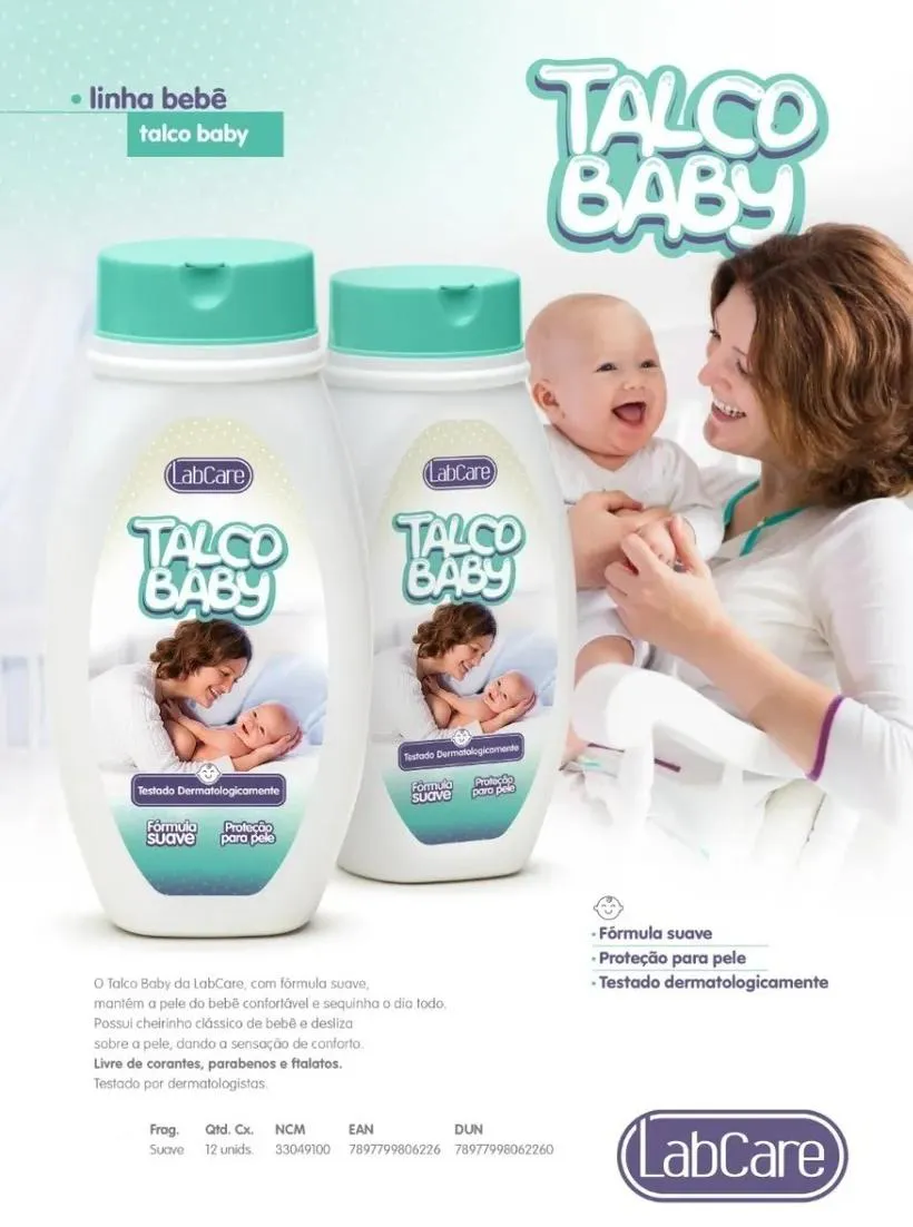 O talco Baby Labcare tem uma textura suave, que controla a umidade da pele do bebê.